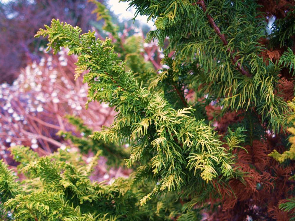 I have planted a number of yellow needled evergreens in the garden. Golden arborvitaes and a few cypresses fade with shorter periods of sunlight, but the golden fernspray cypress (Chamaecyparis obtusa ‘Fernspray Gold’, above) turns the color a few notches brighter for the winter. Golden fernspray is slow growing, and especially effective against the dark green background of taller hollies. In a hot, dry location I’ve seen the gold foliage burn a bit, but this is easily remedied by providing a more organic, moisture retentive soil or with some protection from the late afternoon summer sun.