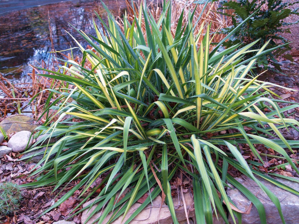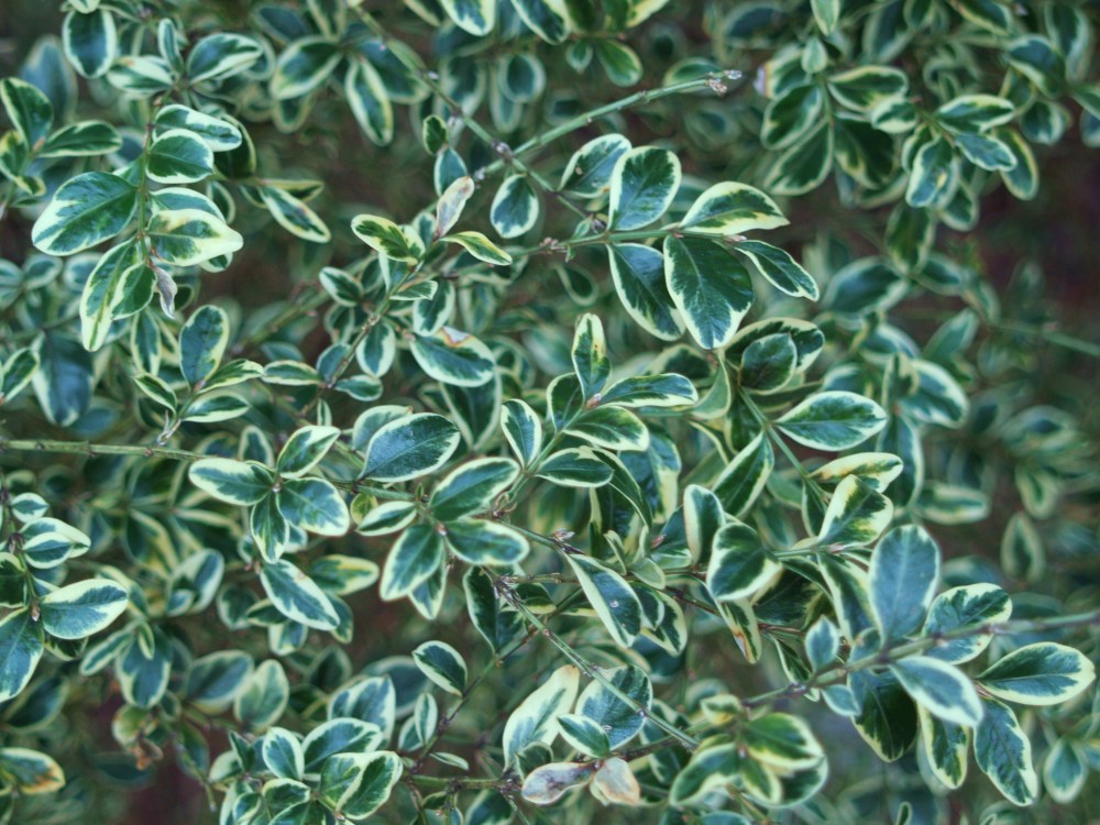 Two other variegated leaf evergreens are marvelous additions to the winter garden, though perhaps not as showy as red and gold leafed plants. Elegantissima boxwood (Buxus sempervirens ‘Variegata’, above) has small rounded leaves with green centers and creamy white edges. It is useful for hedging or as an individual accent, and it will tolerate full sun to partial shade. One that I’ve planted is slowly weakening in ever deepening shade, and it is too large to easily transplant, so next year I must thin the branches of neighboring ‘Seriyu’ Japanese maples, or risk losing it. Another variegated boxwood growing in nearly full sun grows much more vigorously.