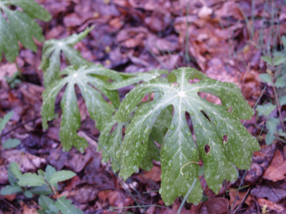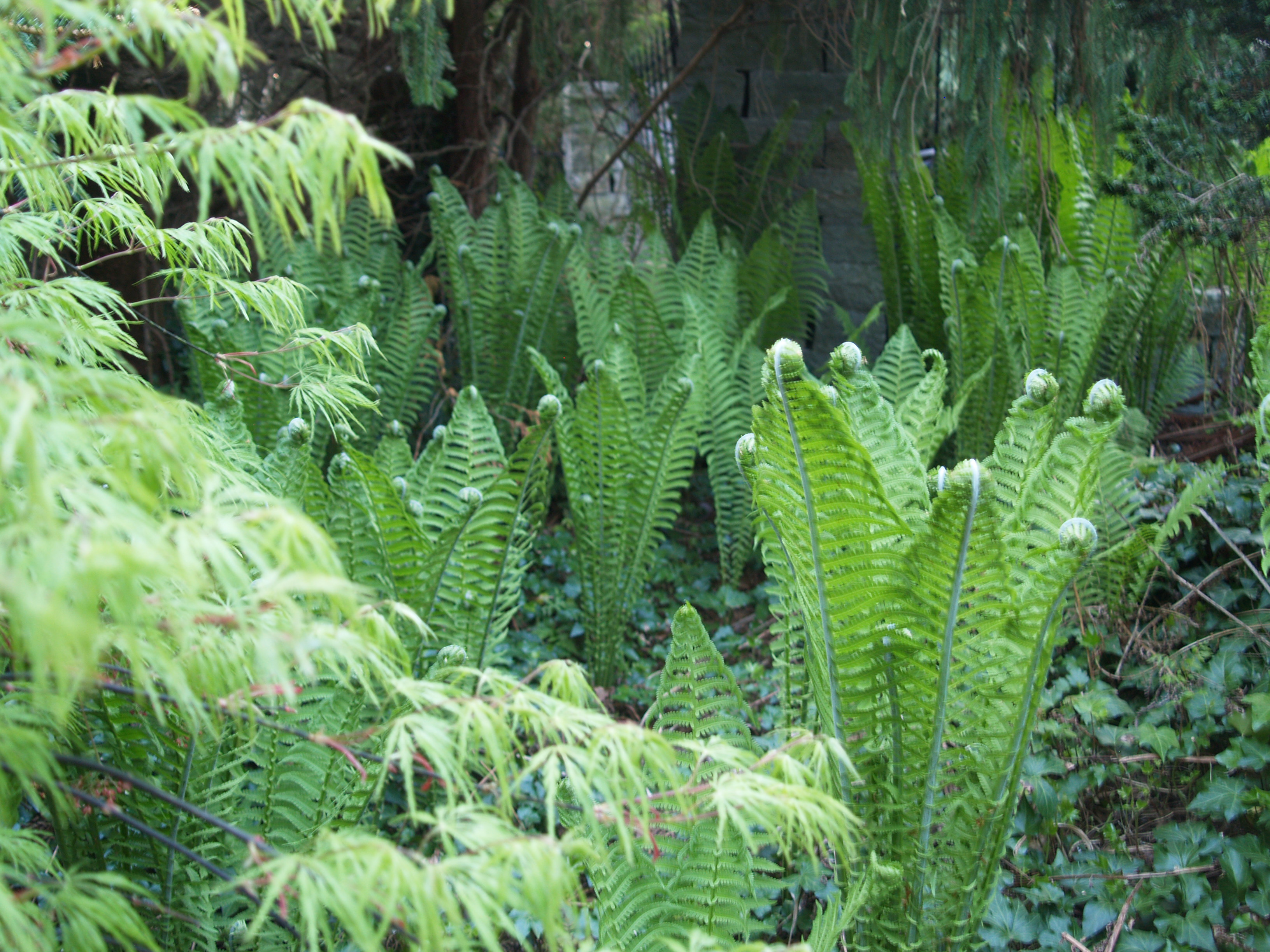 In the spring fed damp ground along the forest’s edge halfway to the back of the rear garden, the skunk cabbages (above) and mayapples (further above) have suddenly emerged, and though the native colony of Ostrich ferns (below) has diminished over the years a few transplants into the garden have flourished and spread. Each year fiddleheads of this vigorous fern pop up through the stone patio, or in cracks in the driveway. They are easily removed and occasionally are transplanted to other open, shaded parts of the garden. In drier shade the ferns are much slower to establish and reluctant to spread, but they are sturdy and return dependably.