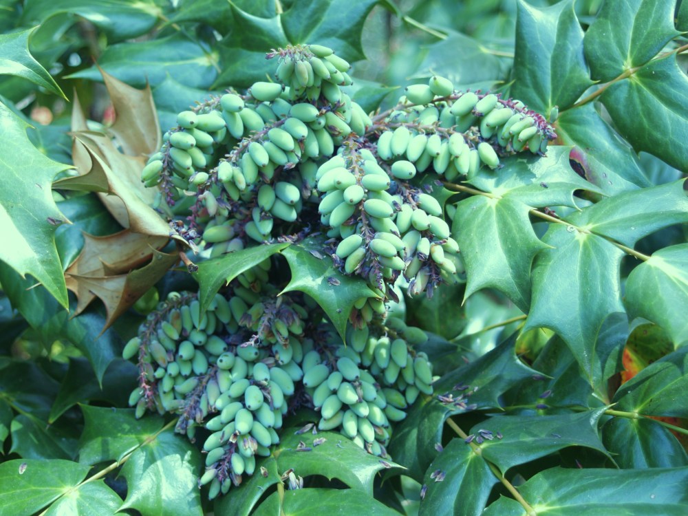 In most years the spring blooming leatherleaf mahonia (Mahonia bealei) would just now be fading, but it began to flower in January and the last flowers called it quits in the heat of mid March. Now, there are heavy clusters of small grape-like fruits (below) that will turn to purple, and as soon as they ripen birds make quick work of them. The fruits of leatherleaf mahonia are much larger and more abundant  than the late autumn flowering ‘Winter Sun’, and often the fruits of ‘Winter Sun’ are ignored by birds.