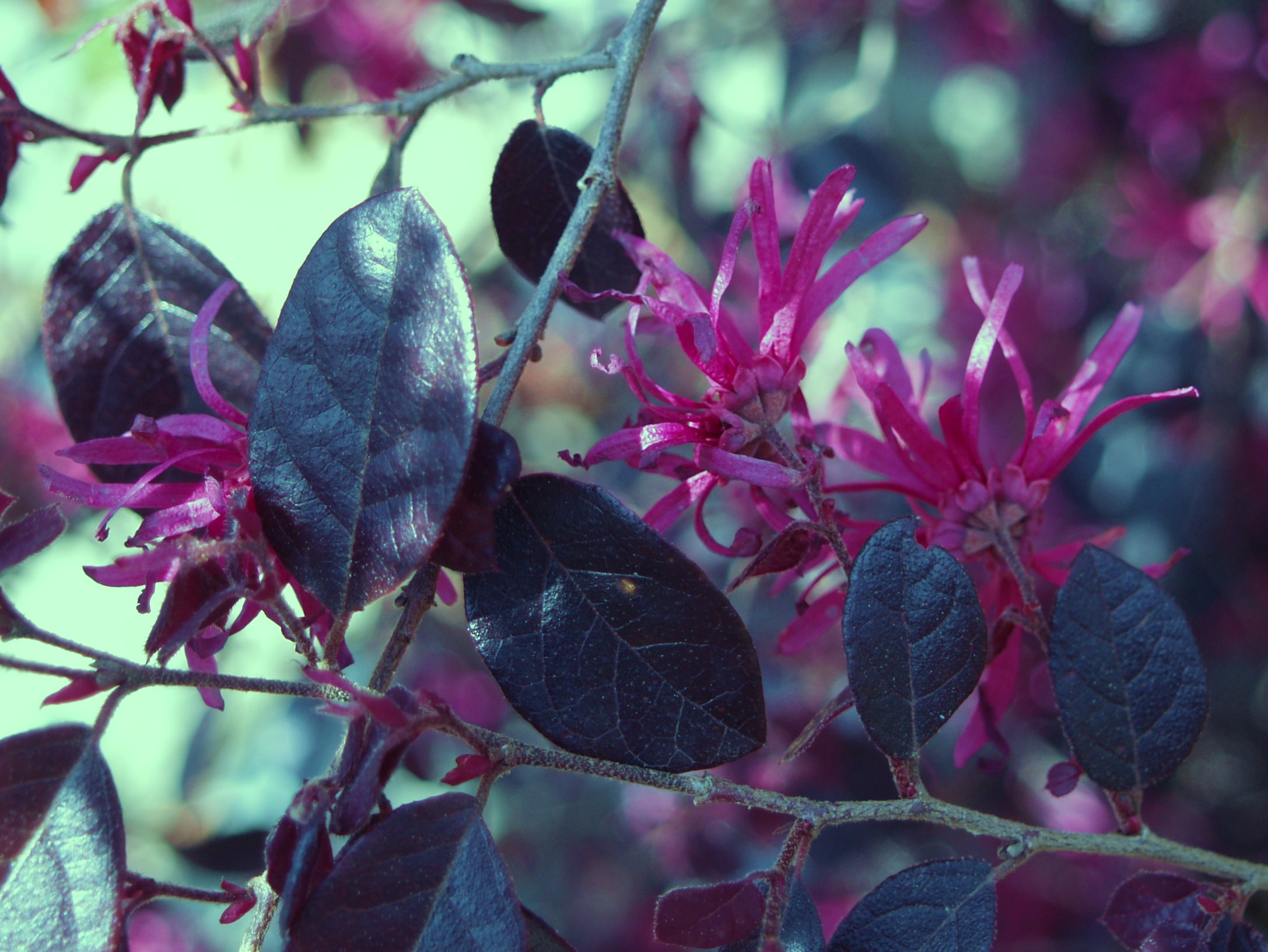 For the first time in my garden there are flowers on the purple loropetalum (Loropetalum chinensis ‘Shang-hi’, ‘Purple Diamond’ (TM), above). I planted it as a cold hardiness trial several years ago, and while it has struggled a bit, it has survived and shows signs that it will settle in for the long term. I’m not ready to proclaim that ‘Purple Diamond’ will flower every spring. I suppose that it blooms dependably in South Carolina, and when northwestern Virginia experiences another winter similar to the norm for the Carolinas, then I’ll expect to see flowers again. The more cold hardy, green leafed ‘Emerald Snow’ is also flowering (below), but it blooms intermittently through the summer so this isn’t too big a surprise.