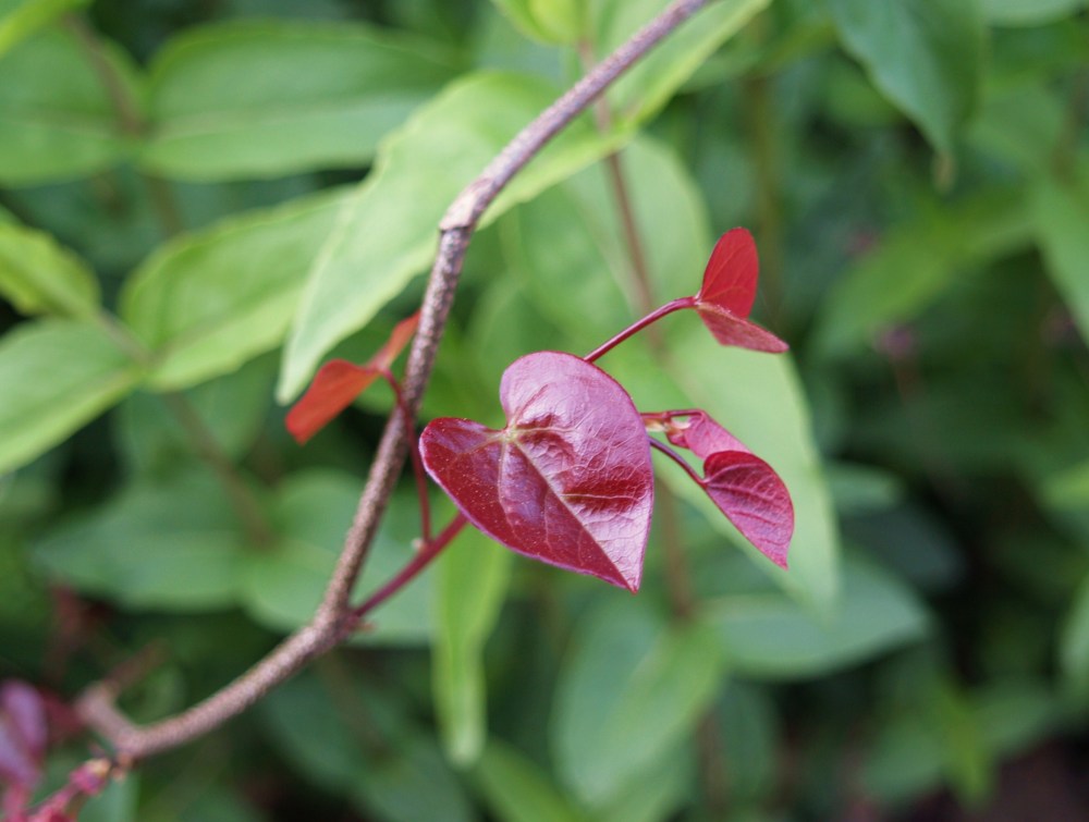 I’ve recently discovered a glossy red leafed redbud seedling (below) growing in my garden. Is it ‘Forest Pansy’? There’s little doubt that part of the new tree’s genetics came from the nearby ‘Forest Pansy’, but there’s another half that contributes to the genes of this tree, so while the seedling might look like a ‘Forest Pansy’, it’s very unlikely that the trees will be identical.