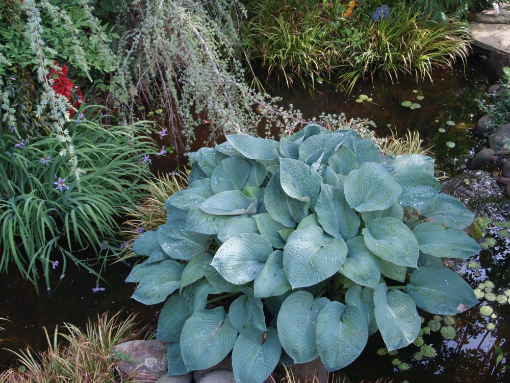 One seedling hosta grows on a small island between two small waterfalls in the middle of one of the garden ponds. At one time only a few stones and river gravel covered the rubber pond liner, then moss began to grow, and then the hosta appeared. At first, I couldn’t imagine that the hosta would survive with so little soil, but its roots have snaked under and around the small rocks and into the shallows of the pond, and the clump is multiplying and obviously enjoying this spot. Now, one waterfall is completely obscured, but I’ve grown fond of this seedling, and it will stay as long as it pleases.