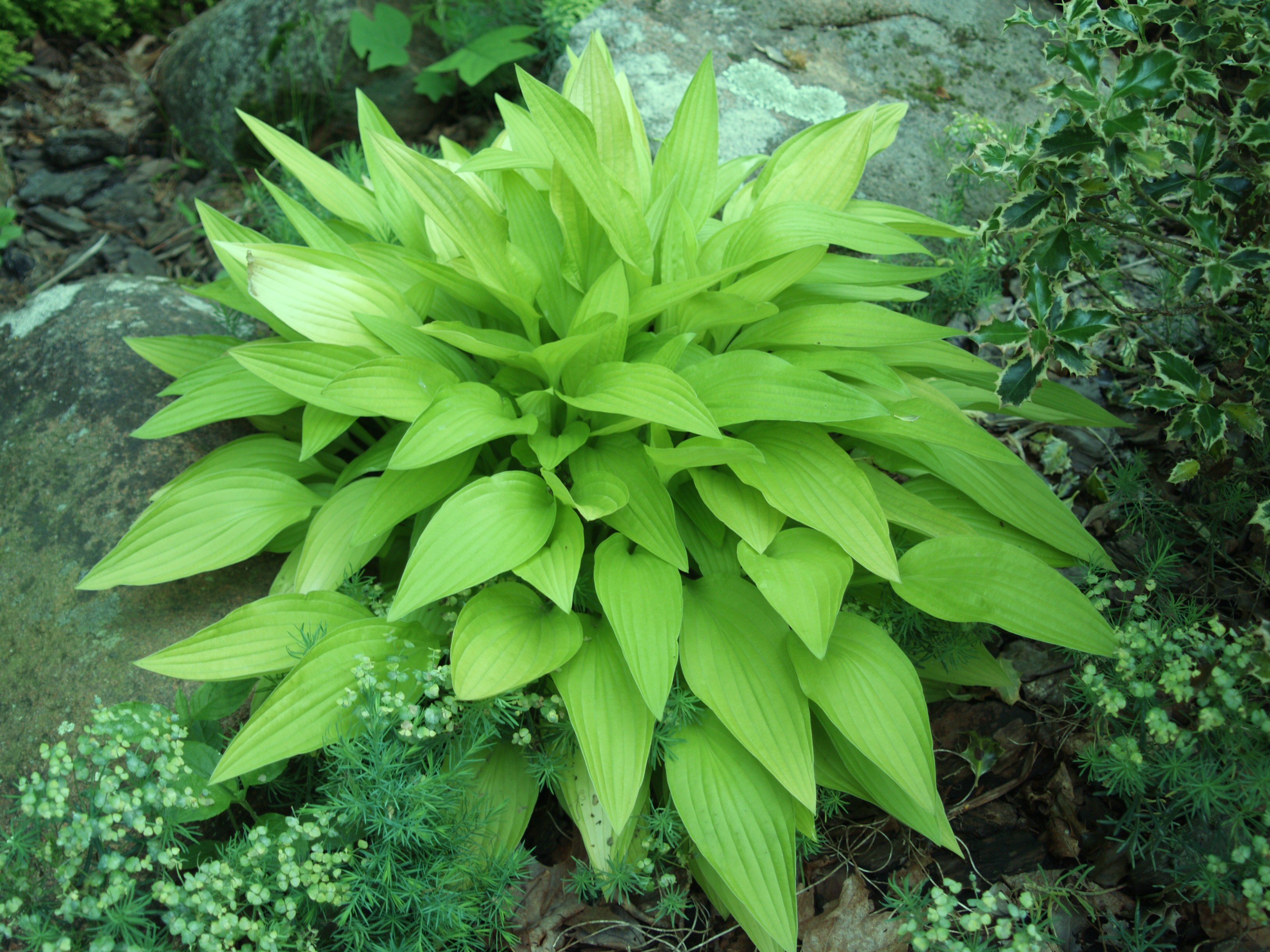 Most of the hostas are planted in medium to heavy shade, though a few have most of a full day’s sun. A few hostas struggle along in root infested dry shade, but even here they perform better than other shade tolerant plants. In slightly damp  or deeper soils the hostas thrive, and the clumps become fat and the leaves large. Though they require almost no care at all, if the gardener makes any effort to keep out deer and invading seedlings the hosta is likely to survive at least as long as the gardener.