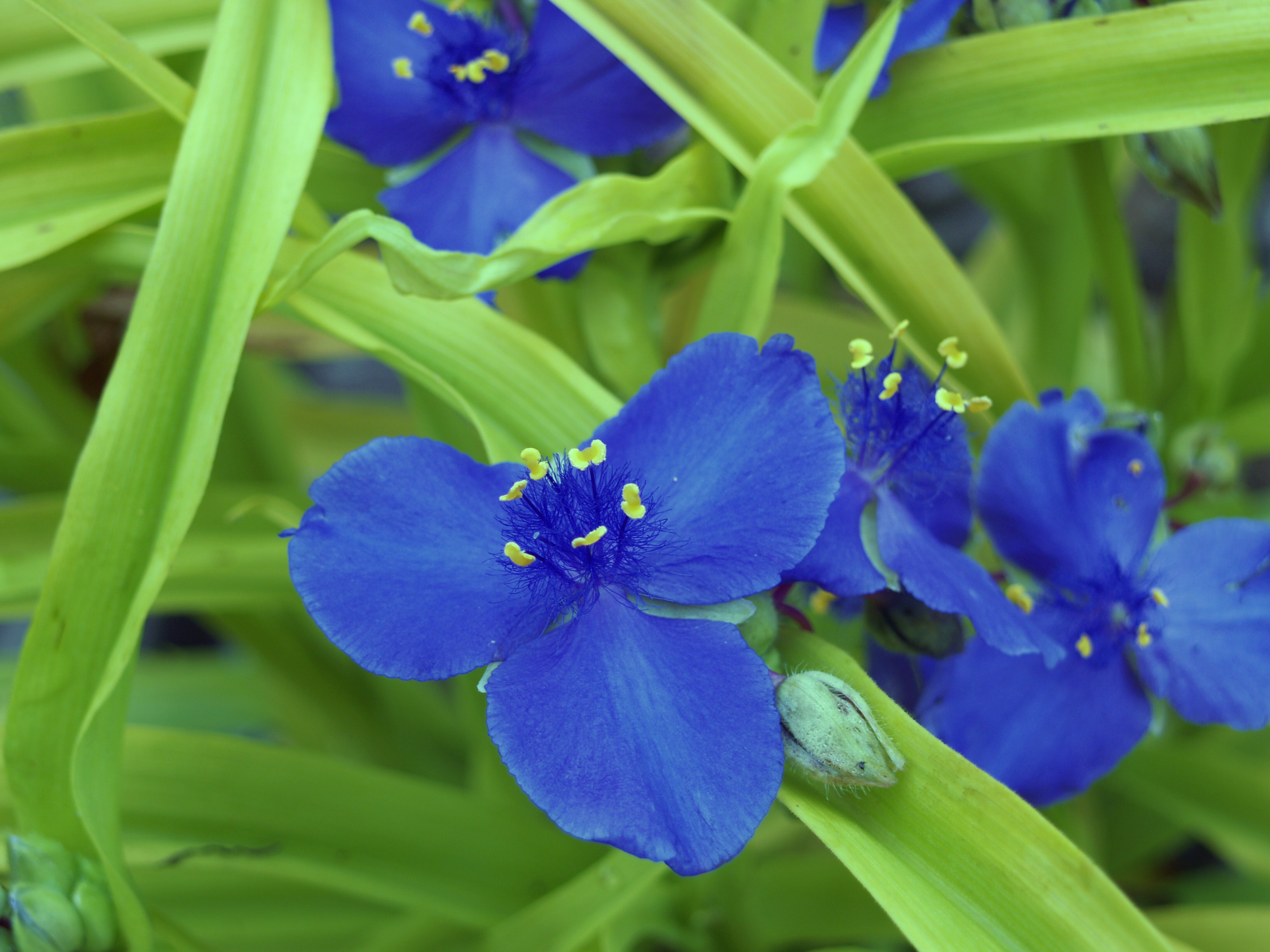 The native spiderwort and the yellow leafed selection ‘Sweet Kate’ (below) are quite vigorous in both damp and dry soils, and though spiderworts prefer sun I have a long established plant that grows in deep shade tucked under an old nandina bush that is shaded by a tree lilac. I am cautious to spray the spiderworts regularly with deer repellent in early spring or the new foliage will quickly be eaten to the ground. It seems deer favor the spiderworts even more than hostas and daylilies, so they should be planted only where deer are not a problem, or by a gardener who will keep up with spraying a repellent. After flowering the foliage of spiderworts quickly becomes spotted and ragged, and they look much better if they’re cut to the ground and allowed to grow back. In this manner they will rebloom again later in the summer.