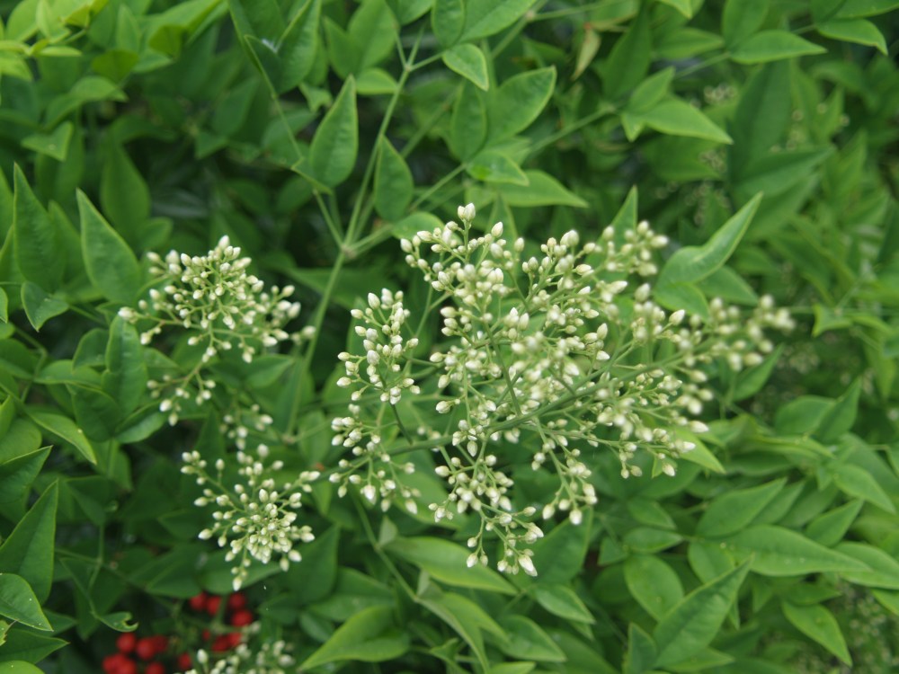 The nandinas are just beginning to flower, but by late summer the branches begin to bend further under the weight of large clusters of shiny red berries (above). Then, my wife can fill a trash can or two.
