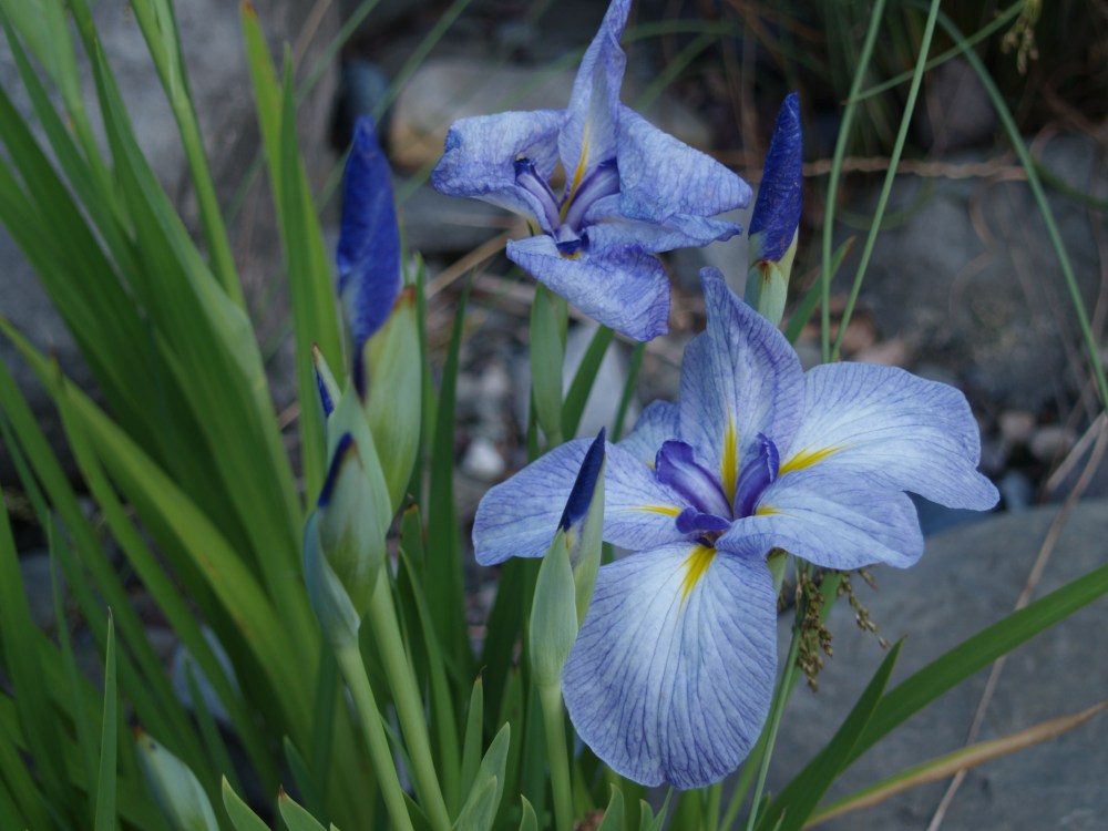 I’ve planted a variety of Japanese irises (Iris ensata) between boulders in shallow water in the swimming pond, and a few in a damp, spring fed swale where other wetland plants are established. In soil, Japanese iris spreads moderately, but planted in full sun in small gravel and shallow water it preforms best, forming thick clumps.
