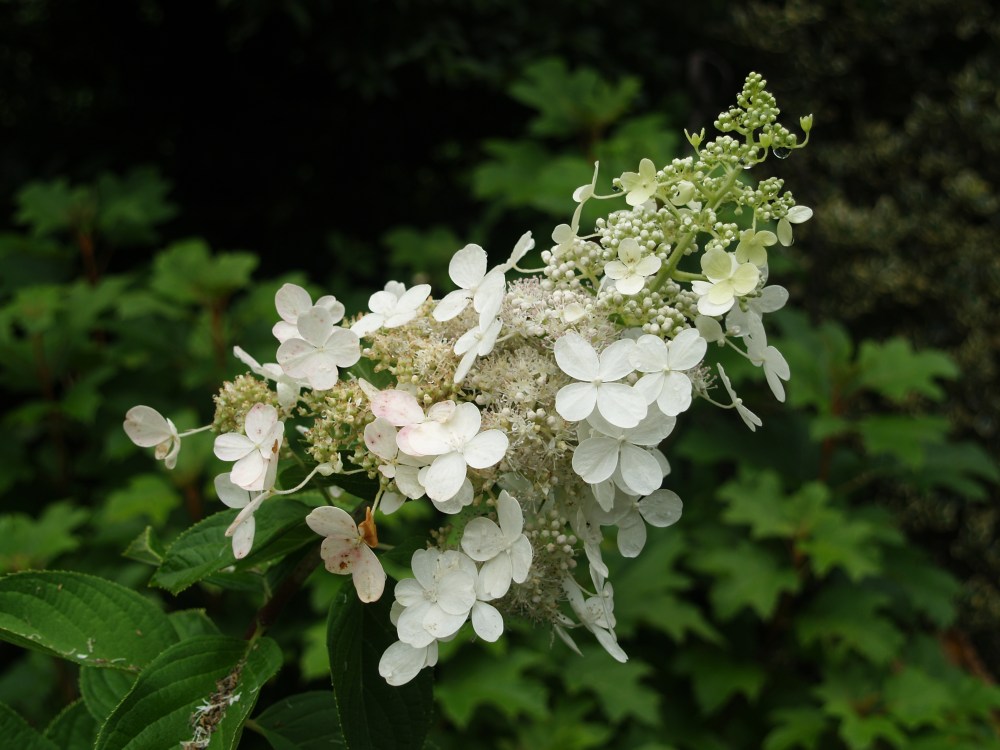 A seedling of Tardiva hydrangea (Hydrangea paniculata ‘Tardiva’, below) has popped up in the middle of the lacecap ‘Twist-n-Shout’ (Hydrangea macrophylla ‘Twist-n-Shout’) . ‘Tardiva’ is a cultivar, so it’s unlikely that the seedling will be identical to the parent plant, but it appears to be very close in appearance. The more pertinent question is, should the seedling be allowed to grow up through the other hydrangea, since panicled hydrangeas grow many time larger than mopheads so that the smaller plant will quickly be overwhelmed?