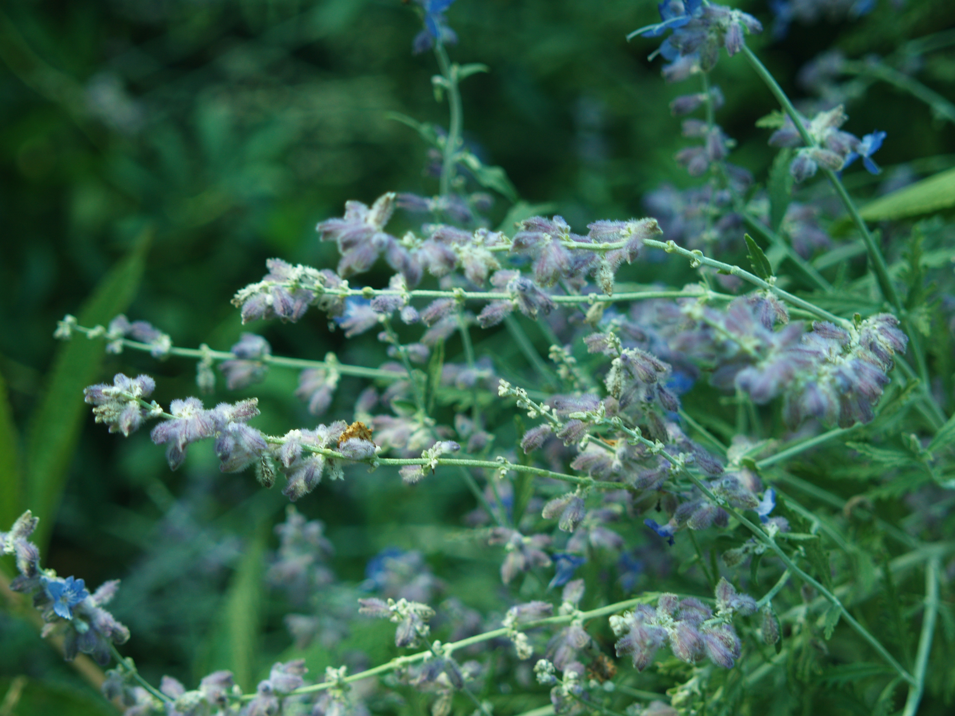 There are plants that thrive in the heat of summer, and seem not to mind infrequent rainfall. Russian sage is certainly one of these, and despite inhospitable conditions it displays its small blue flowers through much of the summer. The blue-green foliage is small and doesn’t make much of a show, but the the upright habit and long period of bloom make Russian sage an ideal perennial for a sunny spot between broad leaf shrubs or slow growing perennials.
