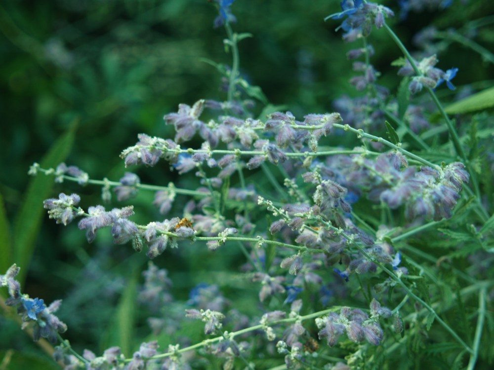 Russian sage (Perovskia atriplicifolia, below) typically grows with a slightly arching, upright habit, but that’s when it’s properly sited in full sun, and not jammed beneath a crapemyrtle and crammed under a wide spreading Joe Pye weed. It deserves better, but no matter, it seems happy enough in my garden. It has flowered since the start of summer, though its stems arch heavily towards the ground. The soil in this spot is lean and dry, but Russian sage is undemanding, and perhaps would resent richer soil with more moisture.