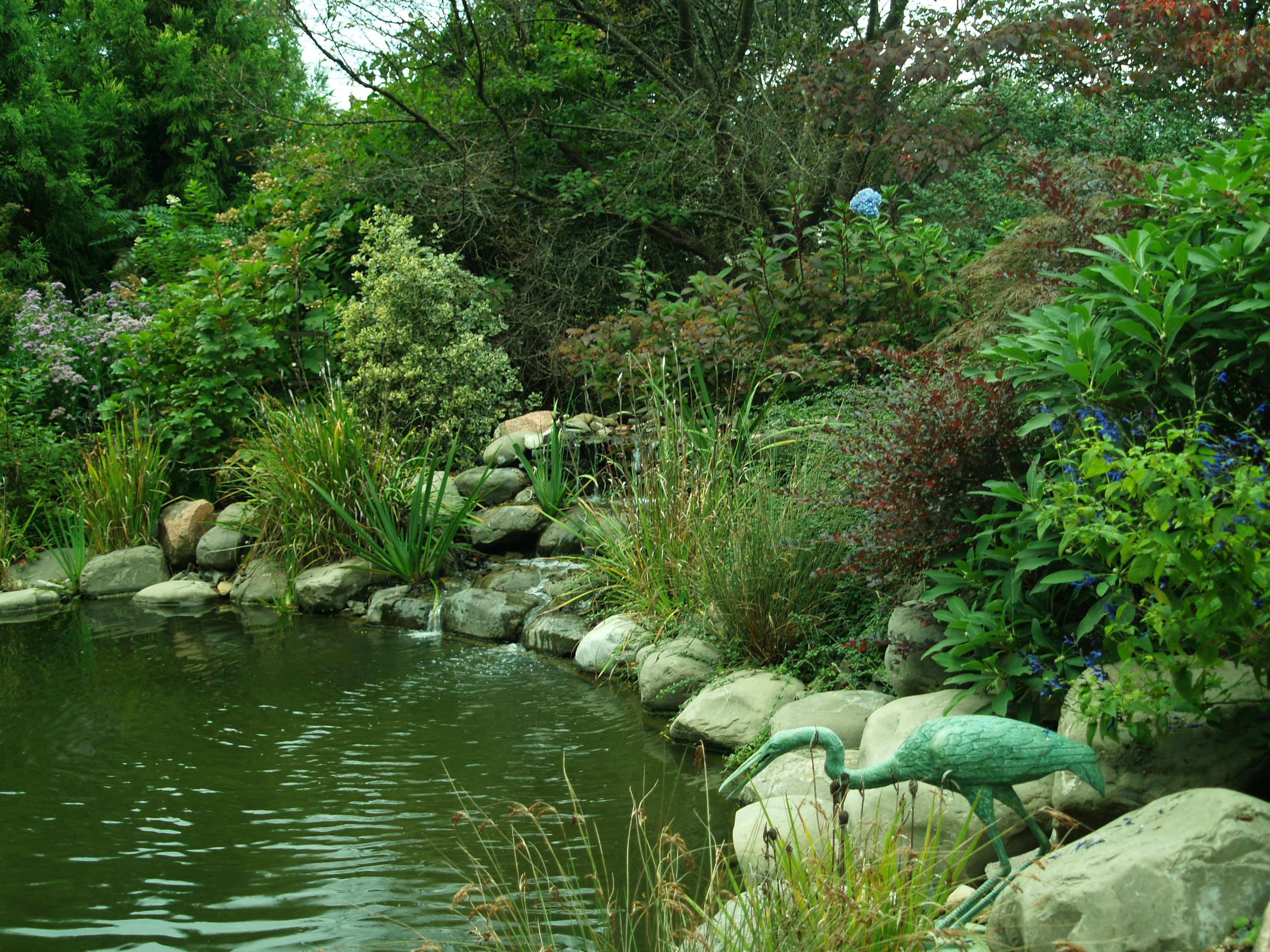 I’ve considered the potential for having a heron tangled in the net, but my priority has been to avoid a big clean up of leaves, so my concern was lessened. Then, I haven’t had a problem, so I suppose that herons tread carefully, or perhaps they can see the net. When I install the netting I run cables across the pond so that most of the net is suspended just above the water, and at the edges it is several inches above so that frogs are able to come and go. On the smaller ponds I stretch the netting across and anchor it at the edges with rocks. I’ve gotten too lazy to cover all of the five ponds, so a couple are left open so any neighborhood critters can drink from it.