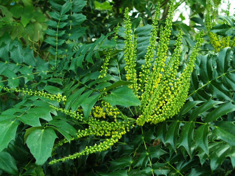 Yes, now that the top of the toad lilies are dormant it’s okay to cut them back. I have mahonias planted in shade and sun, and though they grow faster in sun they will thrive in either situation. The tallest of my ‘Winter Sun’ mahonias is a bit over six feet tall now after seven or eight years in the ground. I think it’s supposed to top out around ten feet, but it could be pruned to maintain a lower height. ‘Winter Sun’ has spined foliage, so it very resistant to deer, though I’ve heard a report that deer ate the flowers. I can’t imagine deer getting their tender noses anywhere close to these leaves. If the deer were starving I figure they’d eat try to eats the bricks off your house rather than draw blood eating mahonia foliage. If it’s planted as a screen it will be a hedge that people will not try to squeeze through.