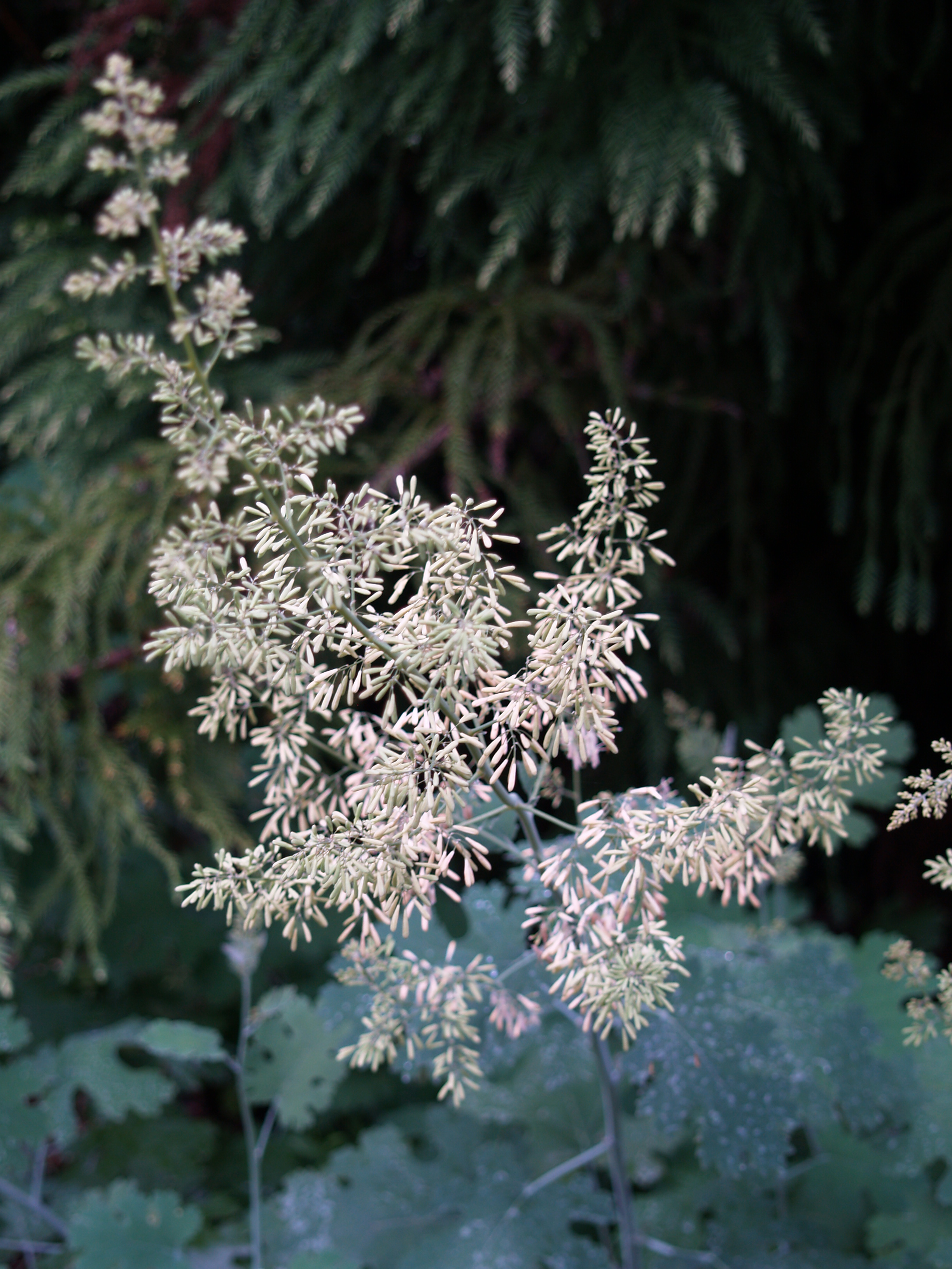 The blooms of the plume poppy promise somewhat more than they deliver (at least to my thinking). As the flowering stalks elongate its seems that the blooms will make a prominent show, but in fact the flowers are not substantial enough. The large, blue-green foliage is the poppy’s principle attraction, though I somehow figured when I first planted it that the leaves would be larger. Visitors to the garden seem to like it, and to fill an area between large evergreens it works wonderfully with a minimum of care besides having to chop off the tall stems from the previous year each spring.