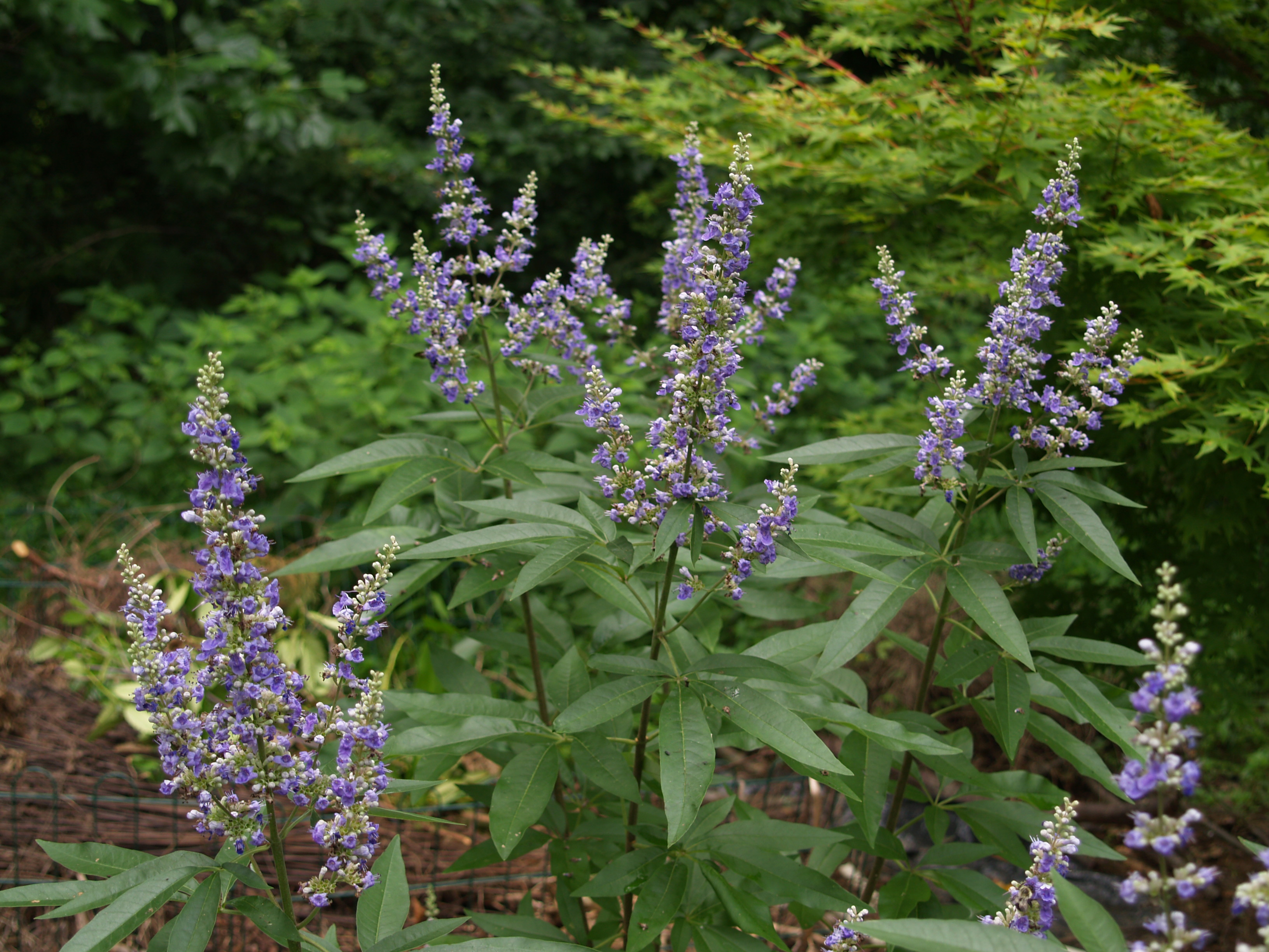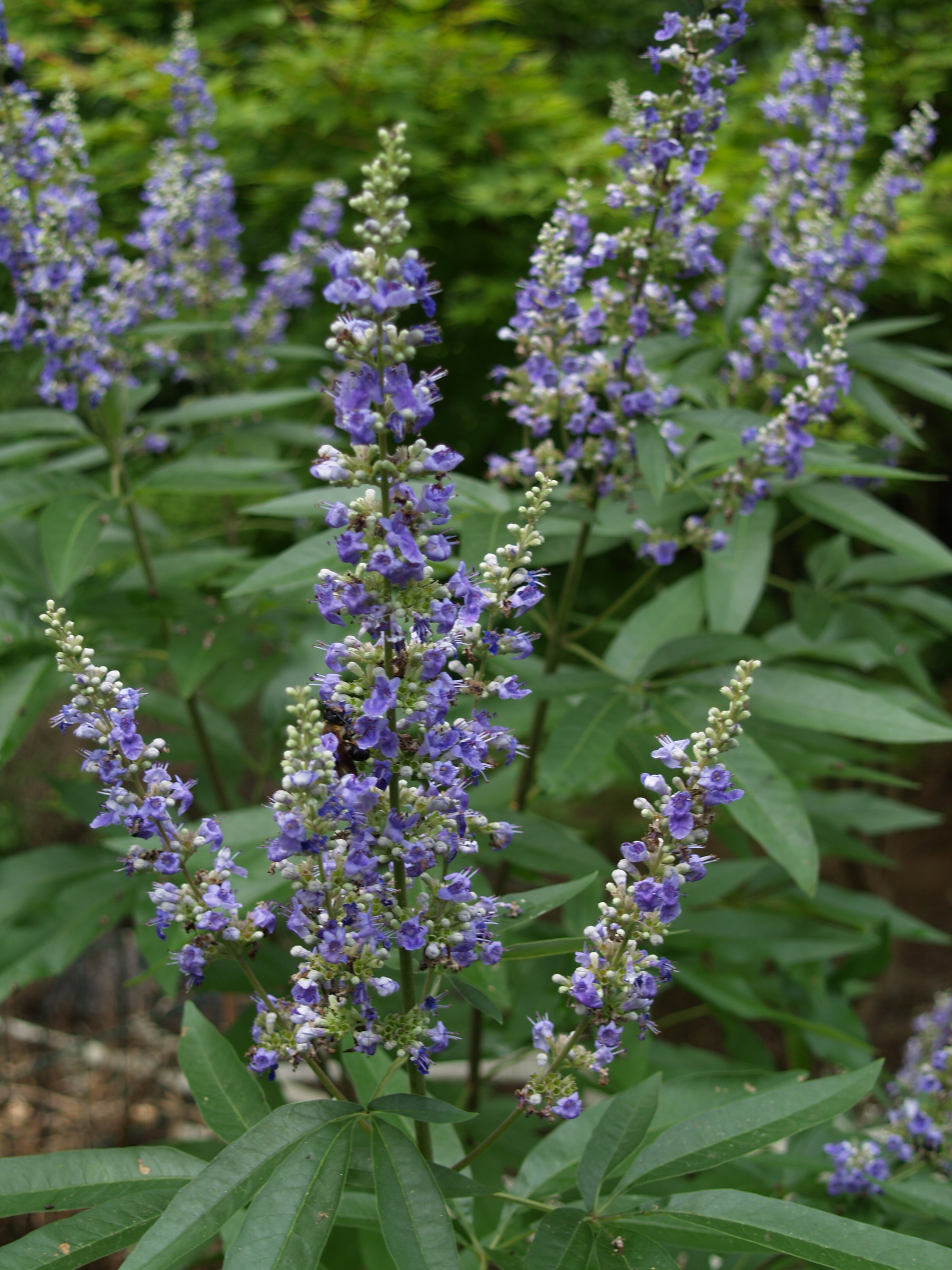 A Chaste tree (Vitex agnus-castus, above and below) sits just above the wettest area, and it shows no ill effect from the wetness. Other shrubs are planted at the edges, and in standing water, but these were selected for their tolerance, while the Chaste tree was not. I’ve seen Vitex pruned to a single trunk, but most often it is a multi-branched large shrub. This is planted in an area that is perhaps a bit too shaded, so that it flowers two weeks later than others, but it seems not to mind the lack of sun or the damp soil.
