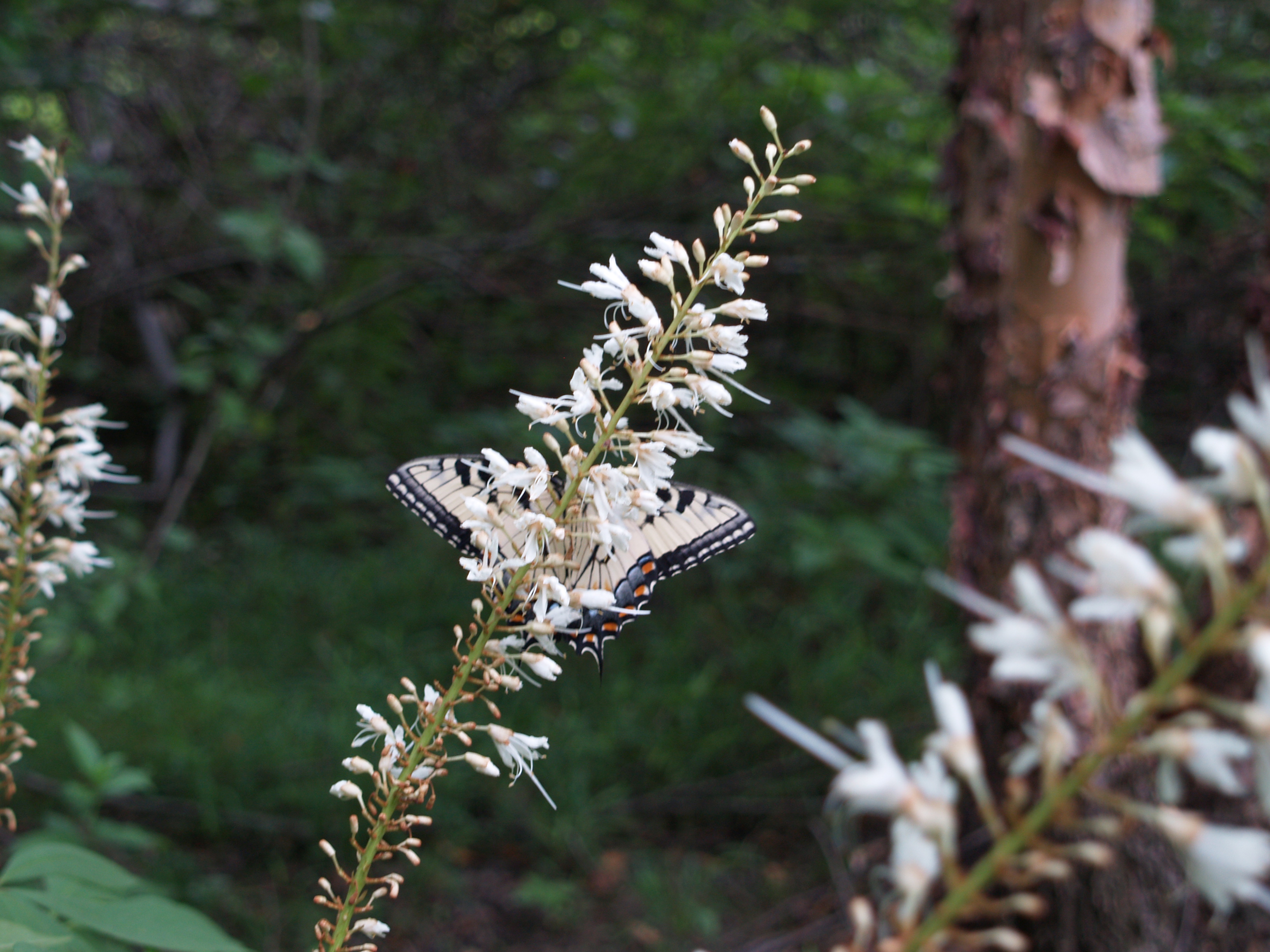 At the low end of the wet swale that borders the garden a seedling of Bottlebrush buckeye (Aesculus parviflora, above) grows under the overhanging branches of a River birch. This treasure appeared several years ago, sprouting in the muck, and now it has grown to a low, wide spreading shrub. Unfortunately, it is difficult to reach through the mud, made worse by deer that have worn a path through this area at the garden’s back edge. But, of course this does not deter butterflies from visiting its white, bottlebrush blooms for a few weeks in July.