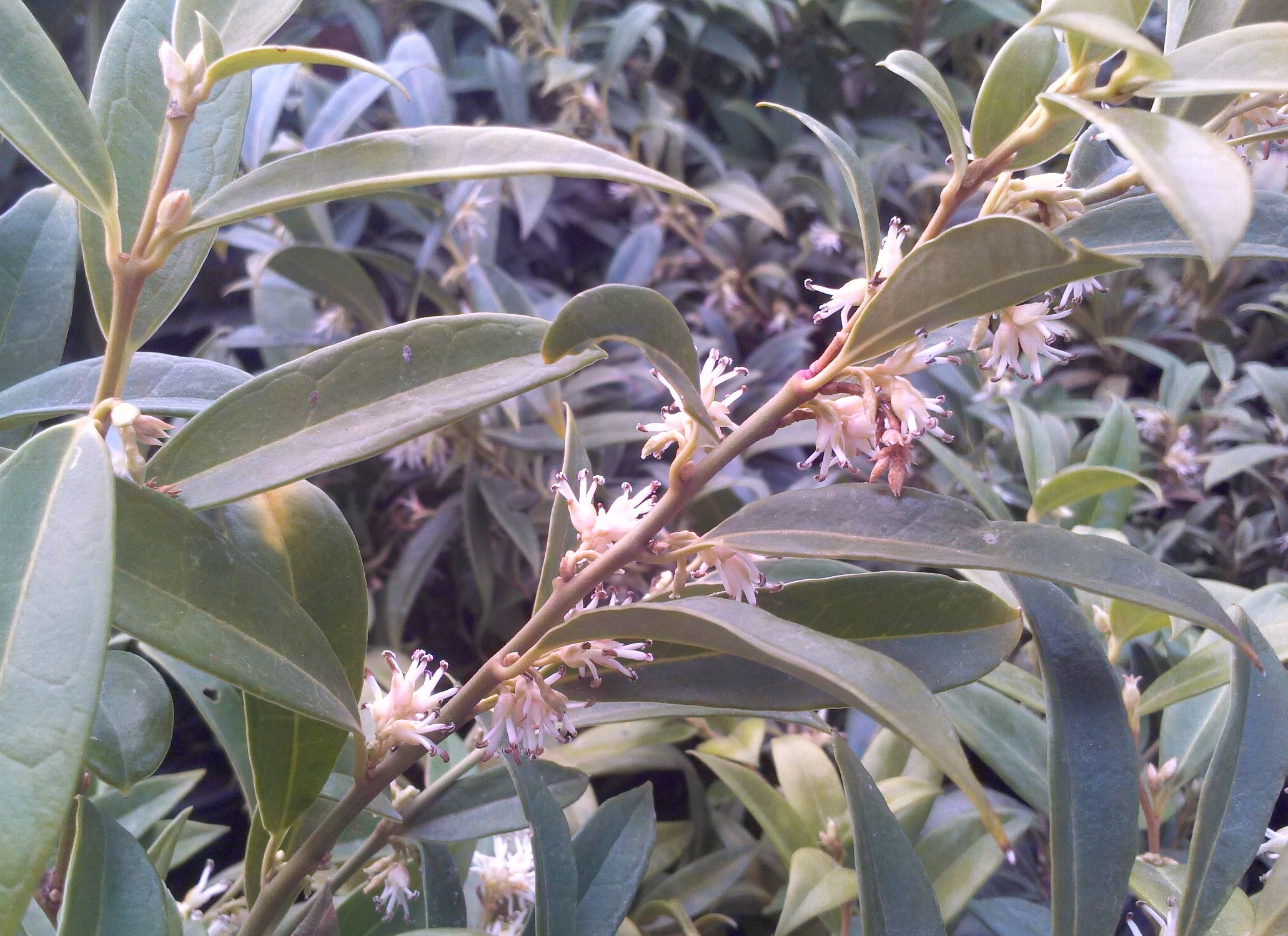 The long established clumps of Sweetbox (Sarcococca hookeriana var. humilis, below) have suffered some through the winter with a few spots of withered foliage. I hope that nothing comes of it, since the slow growing sweetbox takes a while to get going. In recent years, the low growing, evergreen shrub has become more vigorous with stolons spreading to pop up between path stones, but when first planted it seems that sweetbox stands still for a year or two. The tiny, late winter flowers rarely stand out, and again it’s unfortunate that I can’t smell the fragrant blooms at all.Sweetbox in mid March
