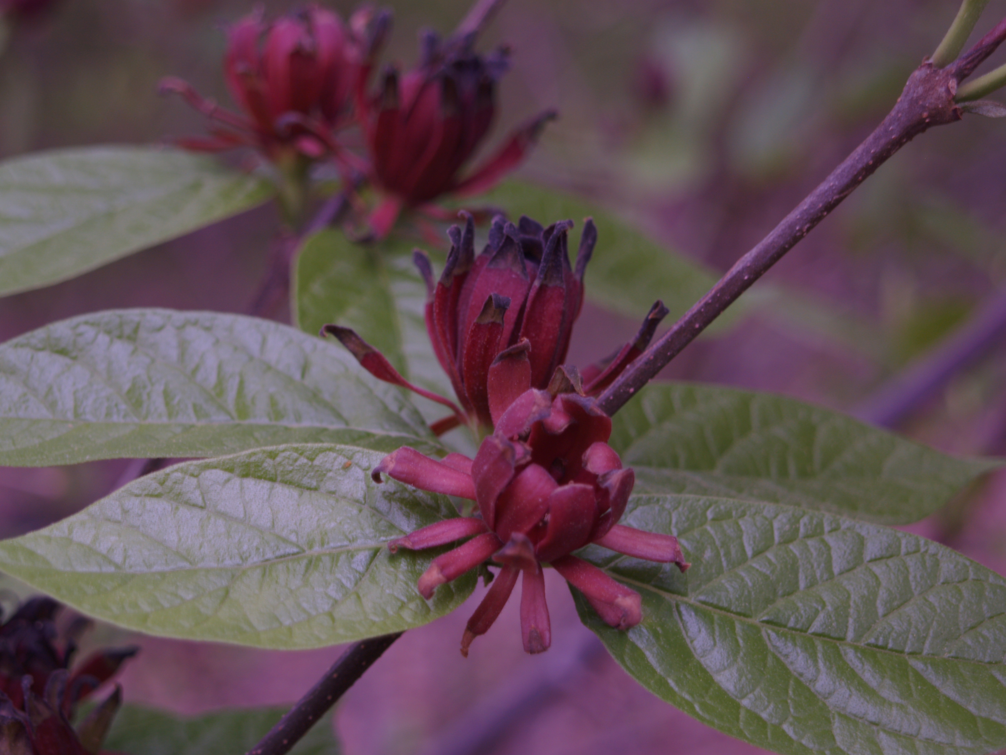 In any case, it appears that the witch hazel will leaf, at least partially, and I’m hopeful that the holly nearby will rebound from its obvious state of distress. Already, a few nearby hydrangeas and smaller shrubs have given up the fight, and like it or not I’m having to plan on replacements. Before the witch hazel and holly fail completely I’ll plant a few red chokeberries (Aronia arbutifolia ‘Brilliantissima’) and sweetwshrubs (Calycanthus floridus, above) in the gaps between. These should thrive in the wetness if I’m able to keep the deer away. A nearby black chokeberry (Aronia melanocarpa, below) is a frequent target of deer, and both red and black will demand continual attention to spraying with a repellent.