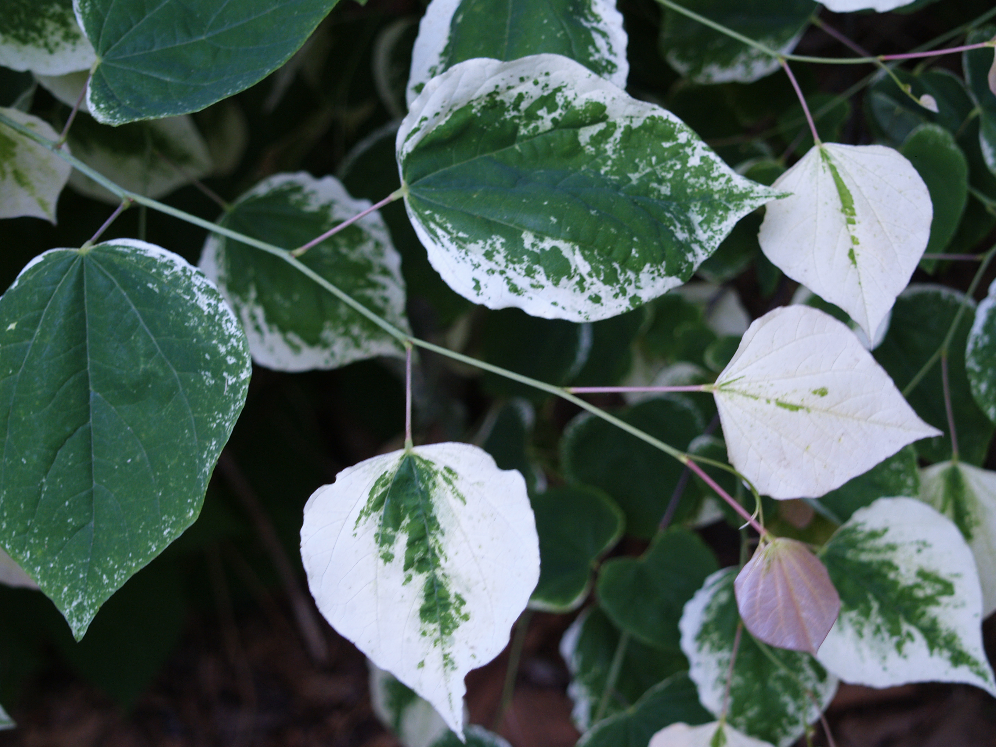 This year the variegation on ‘Silver Cloud’ redbud (Redbud canadensis ‘Silver Cloud’, above) is much more pronounced than in recent years when I began to wonder if the tree was getting tired, or if some malady effected the foliage. The tree appeared healthy, but the leaves were nearly green, with little of the distinctive cream colored mottling. But, this year the cream has returned, and if I said I had any clue why, I’d be fibbing. In any case, the return of of the strikingly variegated foliage is a good thing, and this makes a notable difference in the upper portion of the rear garden.