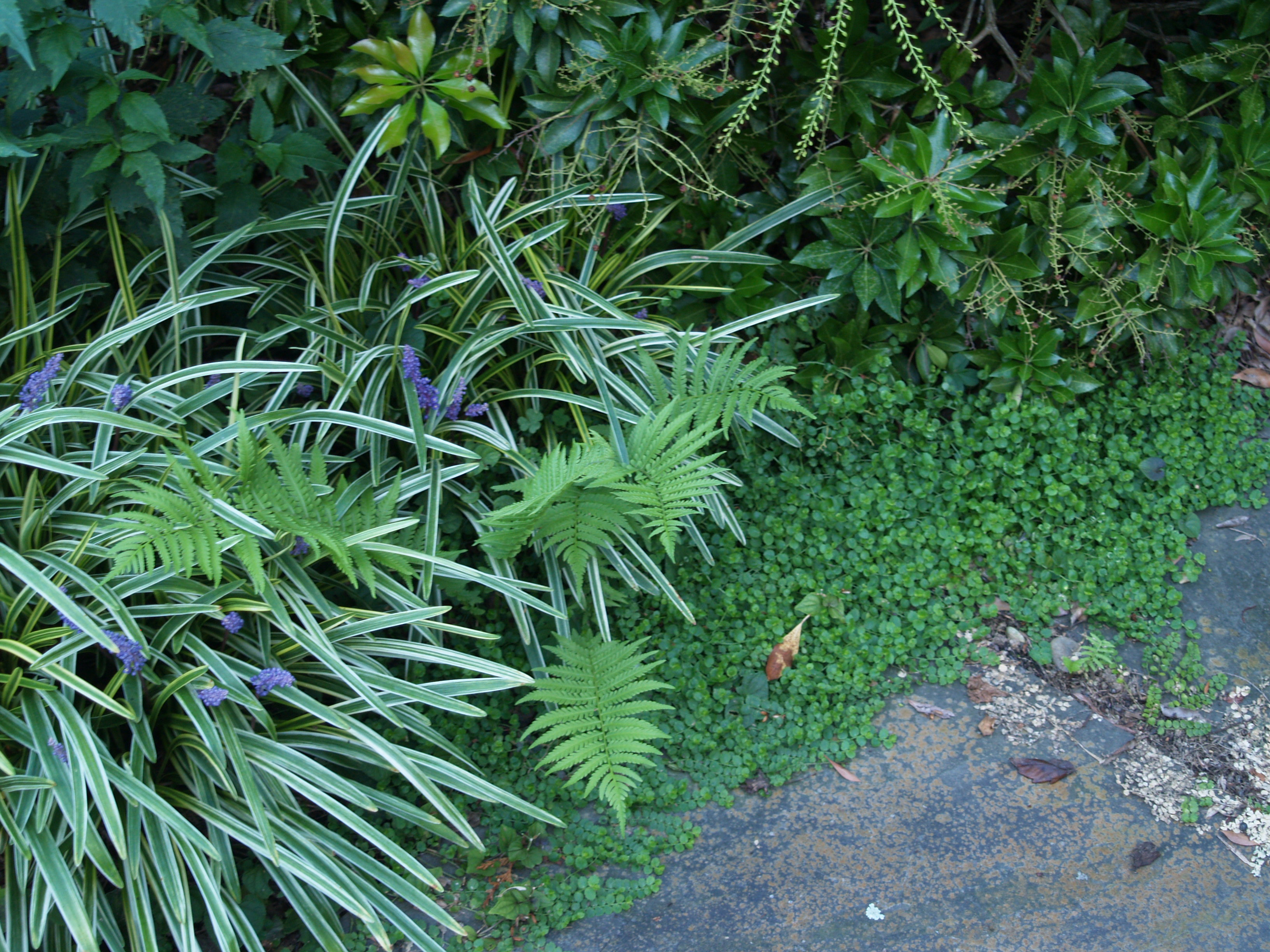 I believe that my wife’s resistance, aside from only being contrary, stems from the few areas where I planted ivies (above) long ago. Several of the ivies are variegated leaf types that grow disappointingly slow, but there are a few green leafed types, and where these are planted beside stone paths they require a bit of maintenance. Which I can be a bit slow on, until the paths are mostly covered.