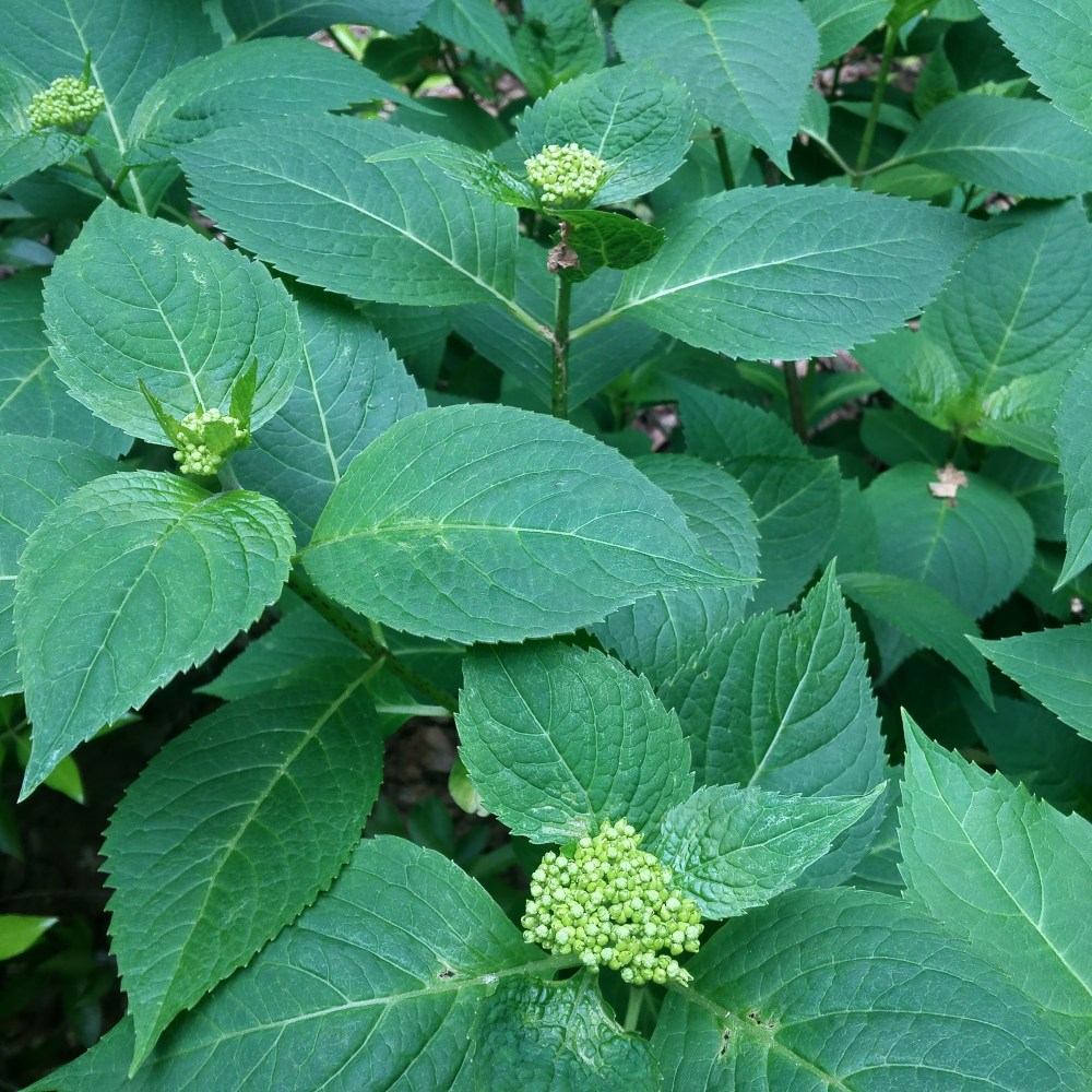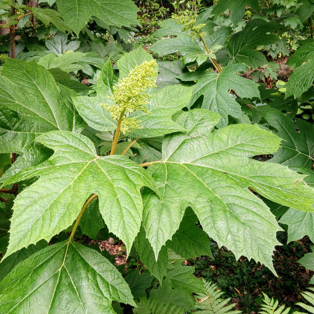 In nearly full sun beside the koi pond, Oakleaf hydrangeas have begun to flower, and in sun and shade leaves are extraordinarily large this spring with recent weeks alternating between summer heat and deluges. Some heat injury has been seen on the yellow leafed ‘Little Honey’ (below), but green leafed types have a sturdier constitution.