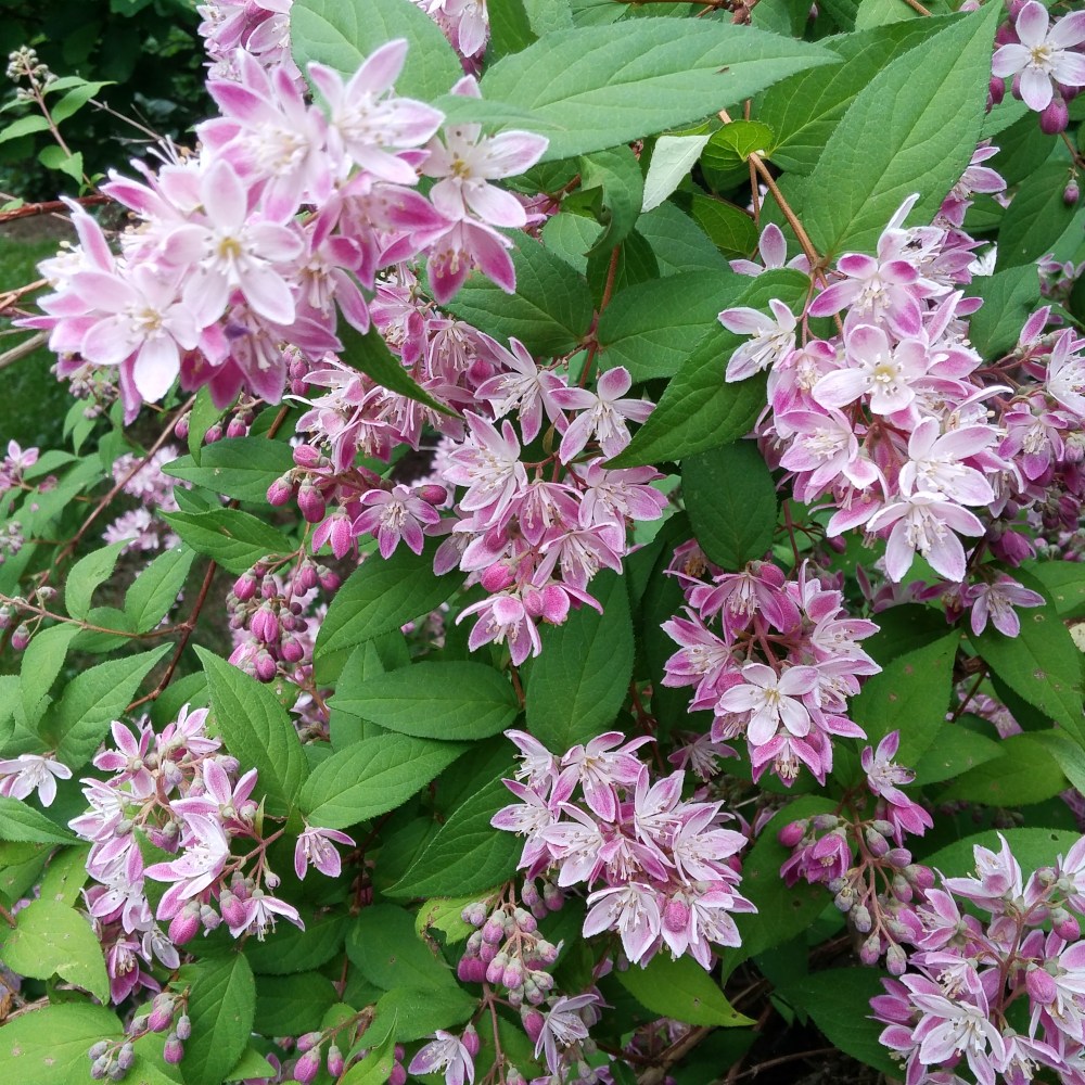 While unremarkable after flowering, there are few shrubs that compare in beauty to deutzias, that are not rare, but are planted far too seldom to my thinking. White flowered ‘Nikko’ and ‘Chardonnay Pearls’ (above) are exceptional in bloom, but I favor the pink flowers edged with white of ‘Magicien’ (Deutzia × hybrida ‘Magicien’). A year ago, ‘Magicien’ suffered in the April freeze, but to my delight it rebounded vigorously.