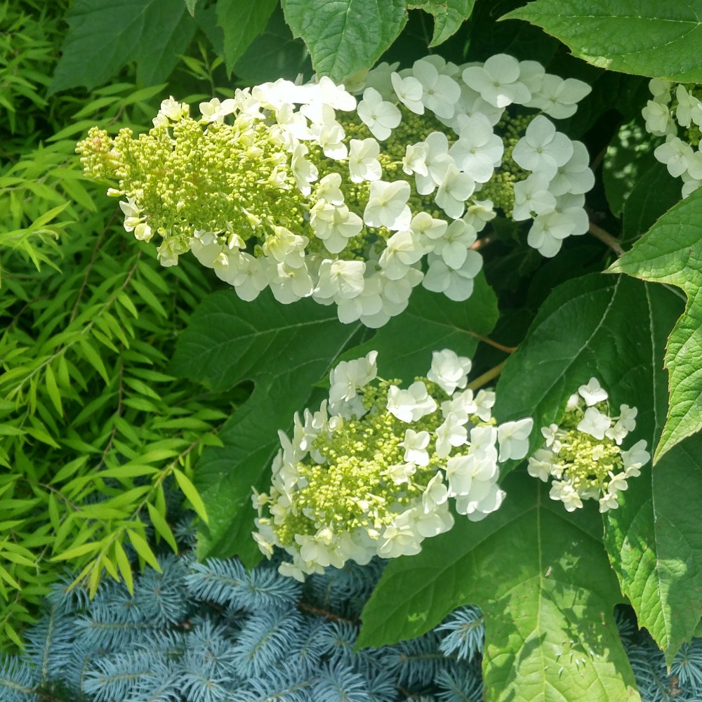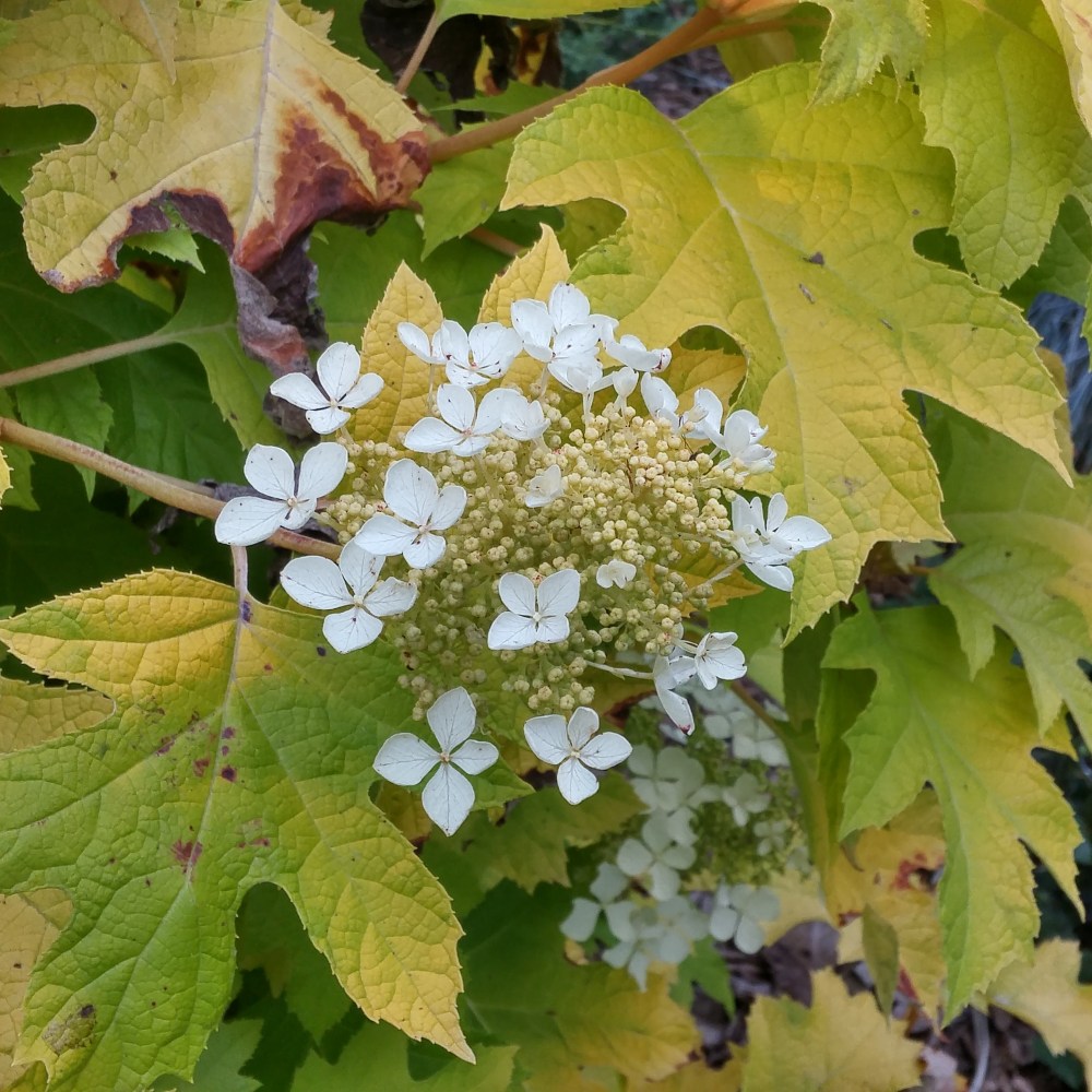 The yellow leafed Oakleaf hydrangea (Hydrangea quercifolia ‘Little Honey’, below) suffered a bit in a brief spell of hot weather in May, with several leaves scorched. It is, however, flowering more abundantly than in previous years, though flowers are considerably smaller than on other Oakleafs. Probably, ‘Little Honey’ would fare better in a shadier spot, but it’s growing vigorously, and it’s far from a favorite, so I’m hardly motivated to move it. At best, the yellow foliage is a novelty, though I’m also not considering chopping it out.