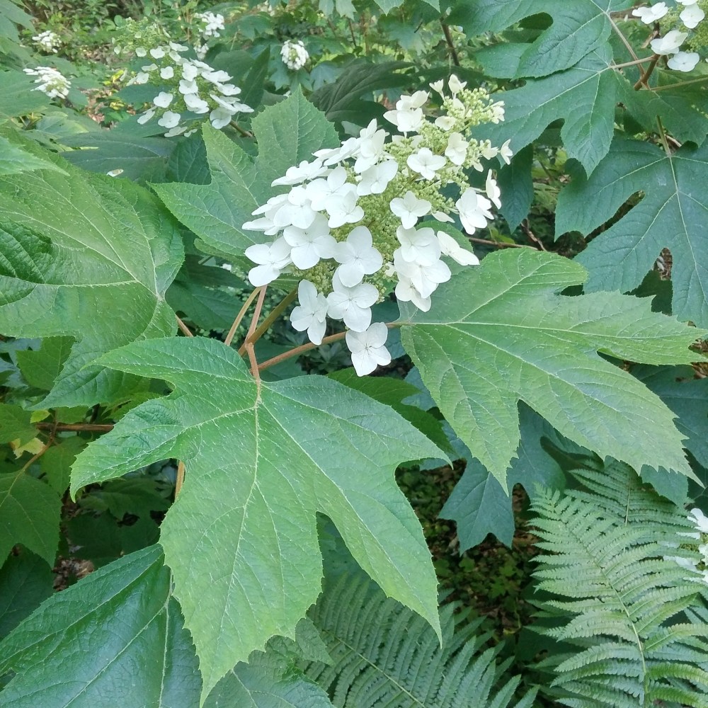 Lacecap and Oakleaf hydrangeas (Hydrangea quercifolia, below) are more tolerant of cold, and Oakleafs are particularly robust this spring. Leaves are larger than usual, and flowers are as good as ever. In several areas of the garden, select branches of Oakleaf hydrangeas must be pruned annually so that neighboring plants are not overwhelmed. There are more compact forms, but branches of larger growing Oakleafs sprawl in every direction, up and over smaller neighbors. I try to keep up with such things, but not everything that should be done gets done.