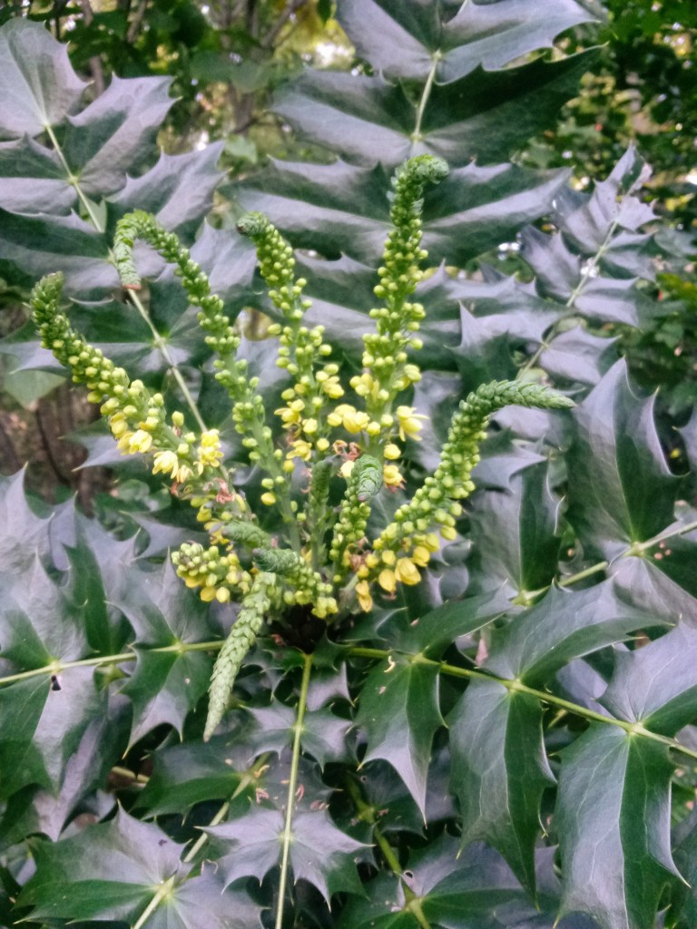 I presume that early flowering of camellias and mahonias must be triggered by early cold, but certainly that has not been the case, and in fact I would judge that recent months have been unusually warm. I cannot recall a time when mahonias began flowering in mid October, though my recollections are too often unreliable and subject to revision. All hybrid mahonias, including the new addition ‘Marvel’ with many fewer spines than others, are showing first blooms, or showing buds that will open in the next few weeks, which is closer to the typical schedule for flowering.