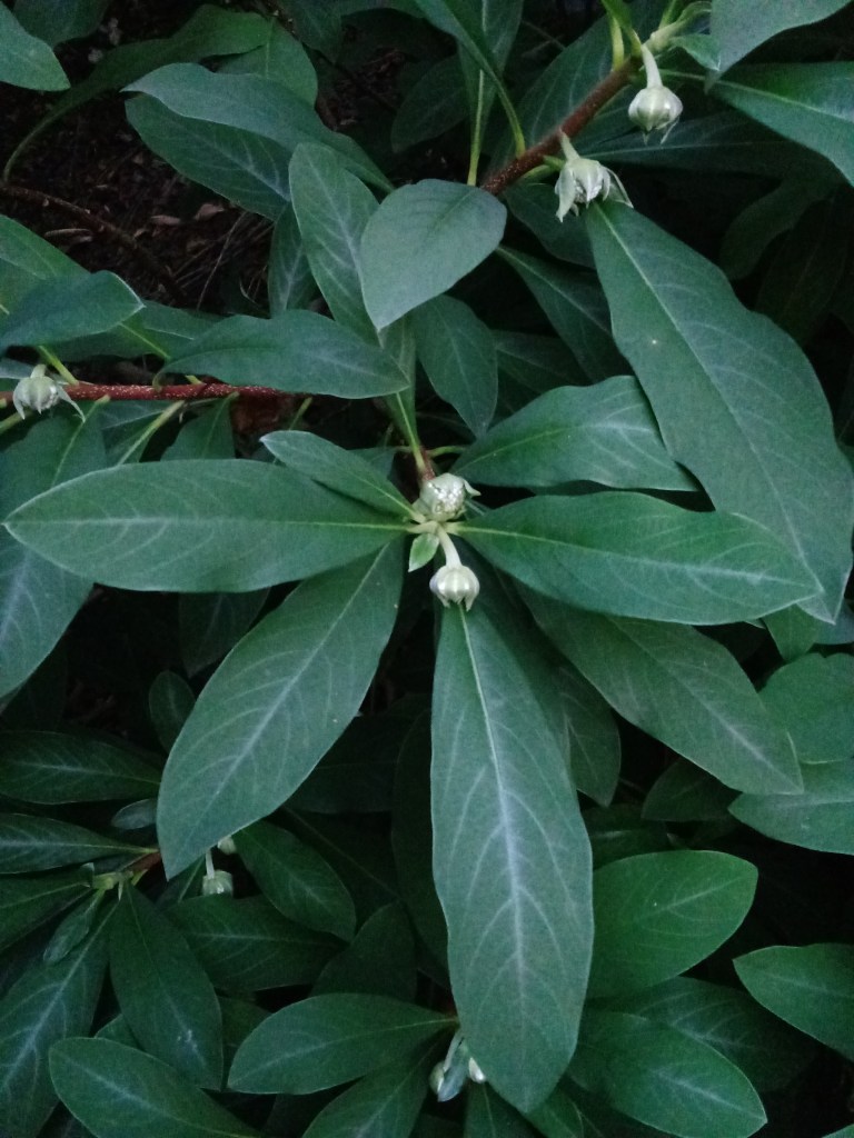 Despite the out of the ordinary number of blooms, this is far from my favored time in the garden, which is clearly in decline. Leaves of Japanese maples turning shades from yellow to burgundy guarantee that in days or weeks the trees will be bare, as some already are. A few shrubs stand against the early cold, but it will not be long before blue-green leaves of paperbushes (Edgeworthia chrysantha, below) turn to yellow and drop, almost overnight following a night that drops into the mid-twenties. I am encouraged that its buds, that will flower anywhere from early February to mid March, are prominent and in abundance. I’ve noted recently that several paperbushes have grown with unusual vigor this year, with pruning of select branches required before spring to salvage hostas and spireas that could be overwhelmed.