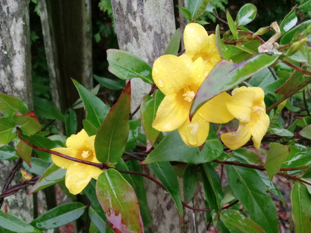 There are wonders to be seen any day in the garden, not only this garden, but in many, no matter the season. Certainly, there are a few to be excited about in early November, and not only colorful leaves. At the start of the month there are many more flowers than expected or typical, and for visitors who figure that there is some special treatment that yields late blooms, I can verify there is not. I can’t explain why Rankin jasmine (Gelsemium rankinii, below) is flowering, or why several toad lilies and reblooming azaleas have survived multiple frosts and thirty-one degrees and continue to bloom.