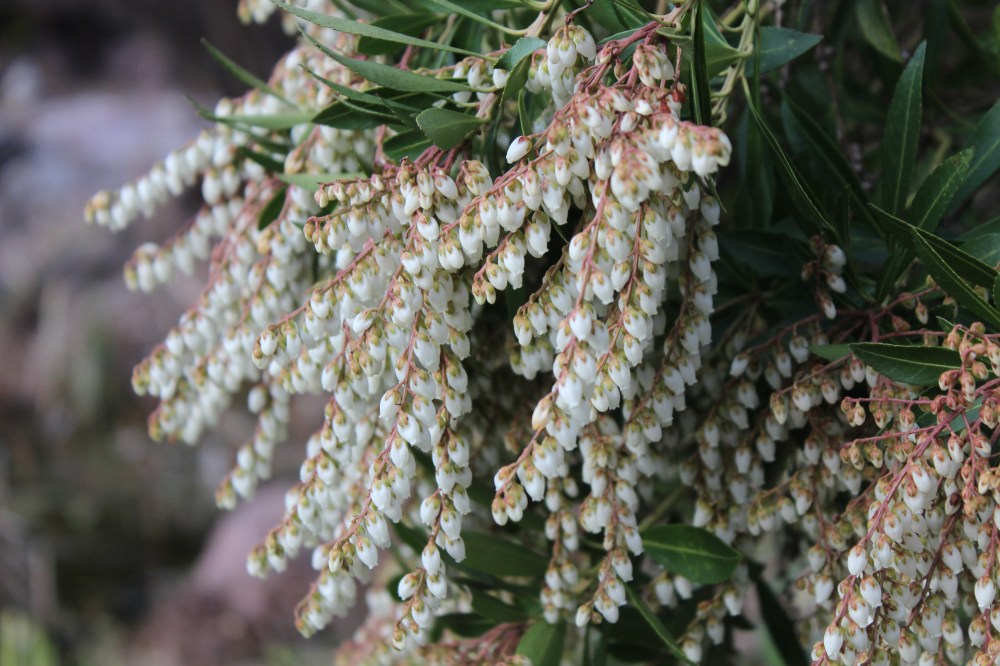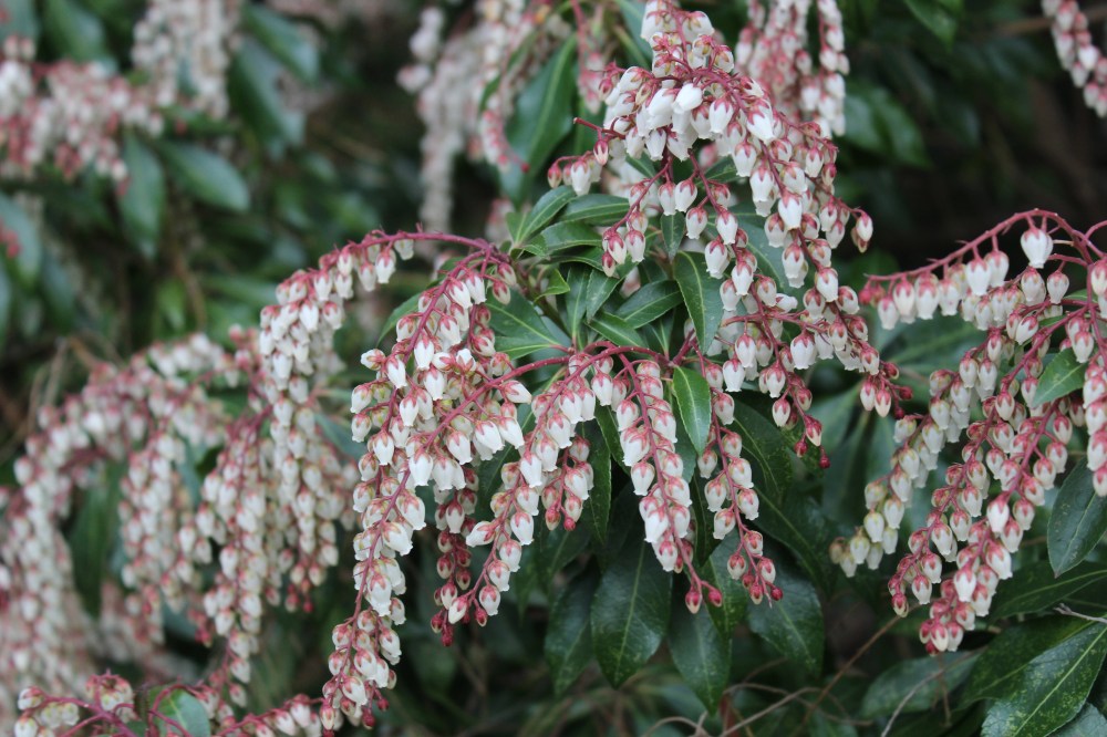 Through mild or cold winters, varieties of Pieris (Pieris japonica and others) flower consistently beginning early March. Flowering time appears to be related more to hours of sunlight than temperature. Pieris is commonly, but incorrectly identified as Andromeda, which is another, dissimilar shrub. A more correct, but wordy, common name is Lily of the Valley shrub. The flowers are similar in appearance to Lily of the Valley (Convallaria), though most Pieris shrubs grow many times larger than the perennial, and several cultivars are treasured as much for colorful foliage as their flowers.