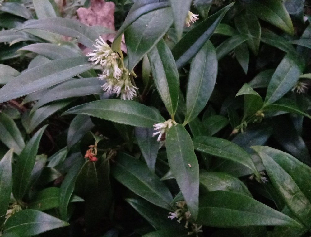 Flowers of sweetbox (Sarcococca humilis, below) are small and unremarkable to the eye, but reportedly carry a strong scent, which unfortunately is unnoticed by my scent challenged nose. Still, all flowers in late winter are appreciated no matter their size, and the glossy, evergreen foliage of the low, spreading shrub is pleasant enough throughout the year. Very slow to get started, some steam is eventually gathered, and now I gleefully prune out underground stems that invade gaps between stones in the adjacent path. The clump of several small shrubs has spread into a rounded mass, and only when temperatures dropped to seven below zero several years ago did the sweetbox show even the slightest sign of unhappiness.