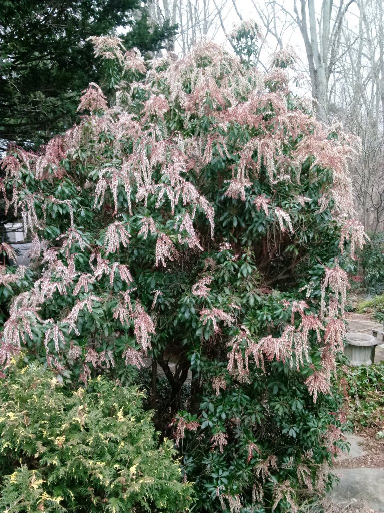 In any case, several Pieris are flowering in early March, with others not far behind. As with many others in this garden, a modest collection of ten or twelve species and cultivars grows with varied successes. Pieris is sensitive to soil moisture, and several have failed over the years in poorly drained areas of clay soil. The shrubs that survive require little attention, though lacebugs are a problem of varying degrees among the varieties.