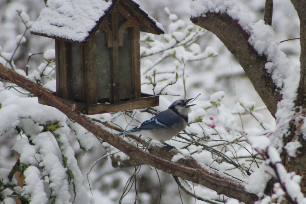 The farm pond and barn just up the road.Flowers of Okame cherry peek out from the snow.Needles of the gold Fernspray cypress covered in snow.Dorothy Wycoff pieris in peak bloom.The low growing February Gold narcissus barely peeks above the snow.Paperbush (Edgeworthia) began flowering in early March, and in cool recent weeks the blooms persist late into the month.Dr. Merrill and Royal Star magnolias often flower the first week of March, but both are tardy this year which is fortunate so that flowers have not been damaged by recent freezes.A cardinal waits for a bluejay to finish at the bird feeder.A bluejay at the feeder.The Cornelian cherry (a dogwood, Cornus mas) flowers in its newly transplanted location in the rear garden.Leatherleaf mahonia began flowering in early March. There have been few days that bees have been out, so flowers might not be pollinated. If not, there will be few of the grape-like fruits (and few seedlings).Low growing hellebores are buried beneath the snow so that flowers are barely seen. Scroll further down the page to see photos of hellebores take a few days earlier.