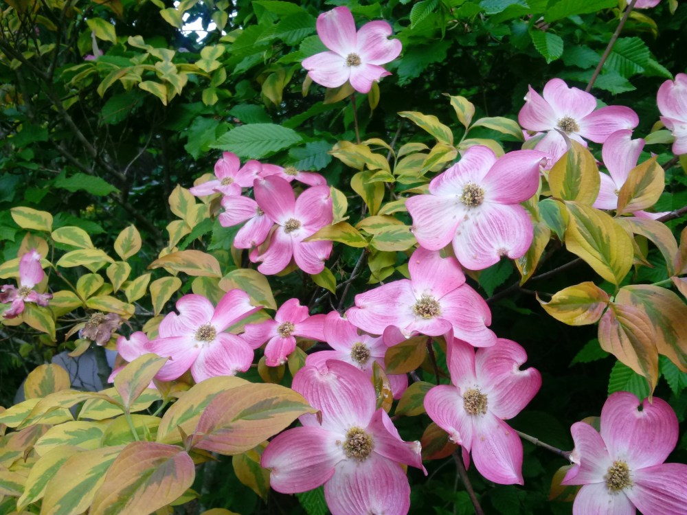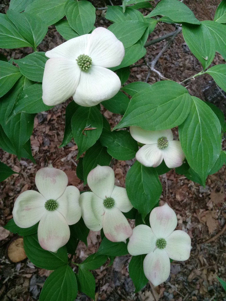 Flowers of the hybrid ‘Stellar Pink’ dogwood are barely pink in this Virginia garden. I’ve seen flowers of this dogwood in the northwest that are fully pink, but that is rare in our warmer, more humid climate. Regardless of flower color, ‘Stellar Pink’ is a vigorous, disease resistant dogwood.