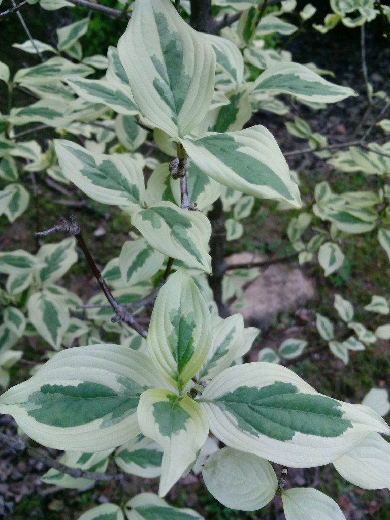 The variegated Cornelian cherry (Cornus mas ‘Variegata’) faded from bloom long ago, but the crisply variegated leaves stand out. This dogwood was transplanted from a dry, shady spot in late winter into partial sun. It appears that the transplant will be a success.