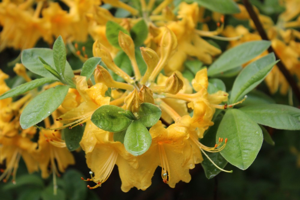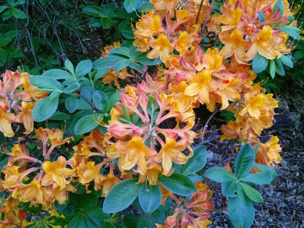 While orange and yellow Exbury azaleas grow into a tangle of branches and flowers, the yellow flowers several days later, and it seems clear that it is the more fragrant.