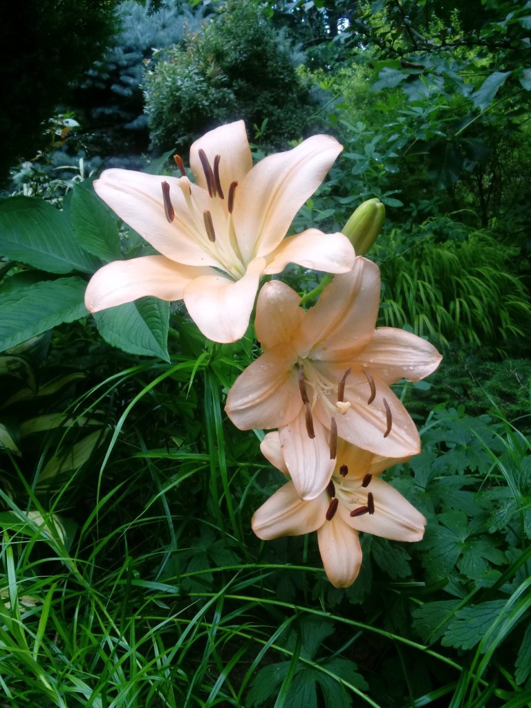 Several of the Oriental lilies have come into bloom and faded. It seems that the coming and going was quicker than usual, and several are barely seen now as plantings around the koi pond have grown up. I planted several new lilies earlier in the spring, and while one with distinctive markings (above) didn’t seem to last until the flowers were fully open. another is flowering now (below), ten days after others. Since the lilies are here for such a short period, they’re planted with lots of neighbors, and occasionally they’re lost in the jumble if the variety is one with shorter stems.