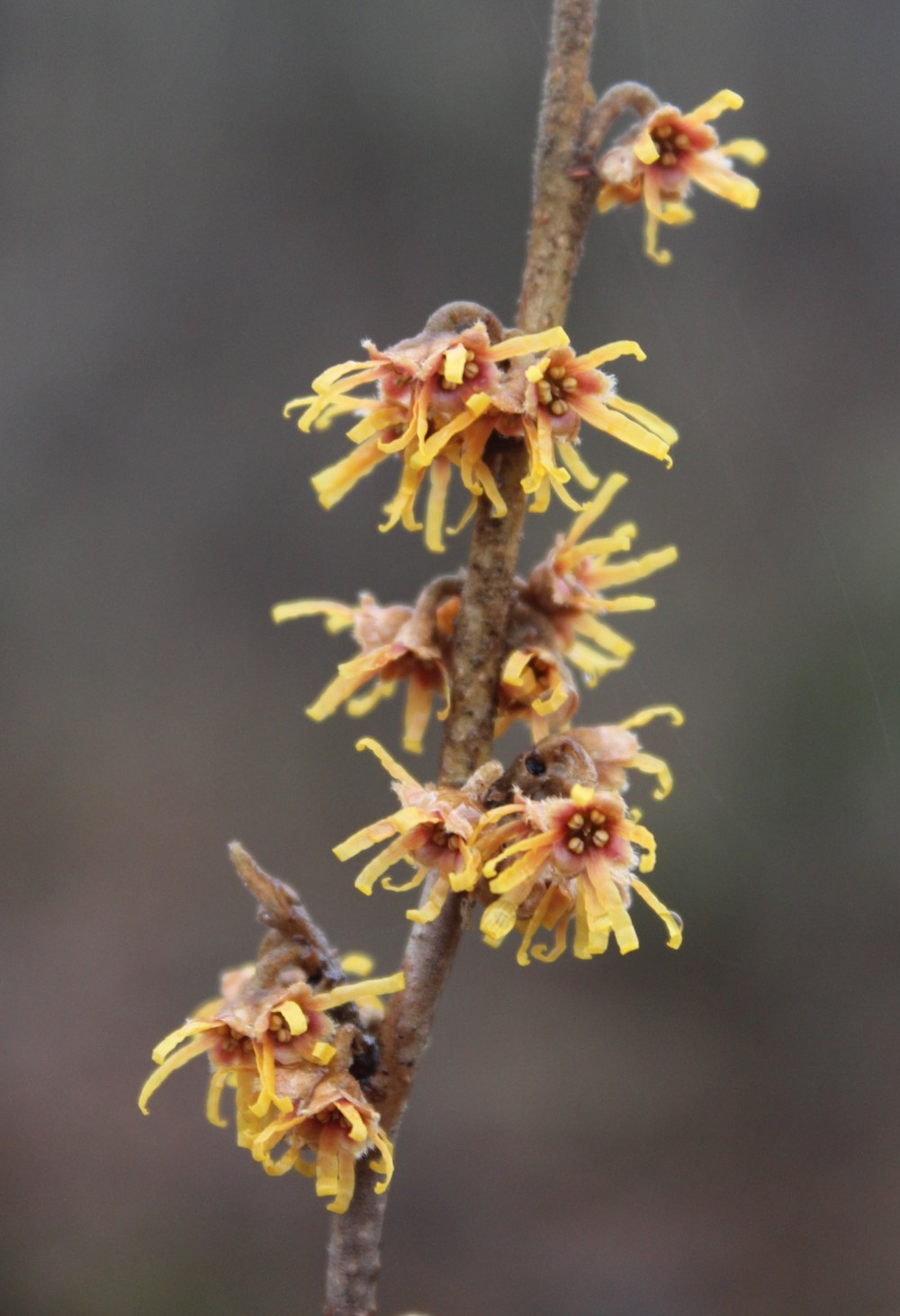 Oddly, two witch hazels (Hamamelis x intermedia, above) flowered on several branches a month ago, but other branches did not flower, and buds have not swelled unusually. So, some mid-winter blooms will be missed, but not enough I think, to bring disappointment. Most disappointing is that one red flowered ‘Diane’ has become overly shaded by a nearby katsura, with dead branches in the shadiest areas and few flower buds.