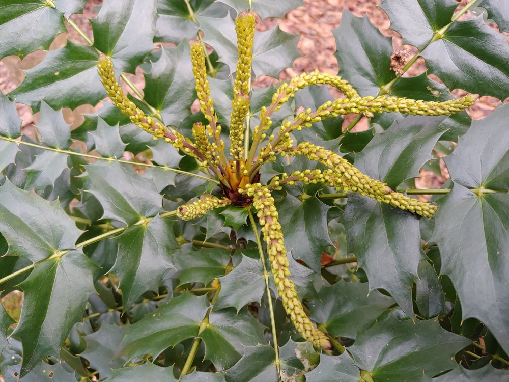 Most unusual, late autumn flowering mahonias (Mahonia x media) have not yet begun to flower in mid-December. For weeks, the yellow blooms have been ready to pop any moment, it seems, needing only a day or two of mild temperatures to open. Most often, first flowers are seen in early November, but once flowering begins it is likely to extend through much of January if winter temperatures are not too severe.