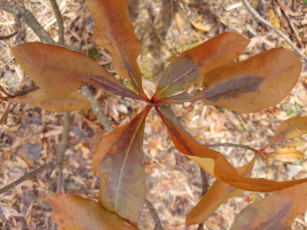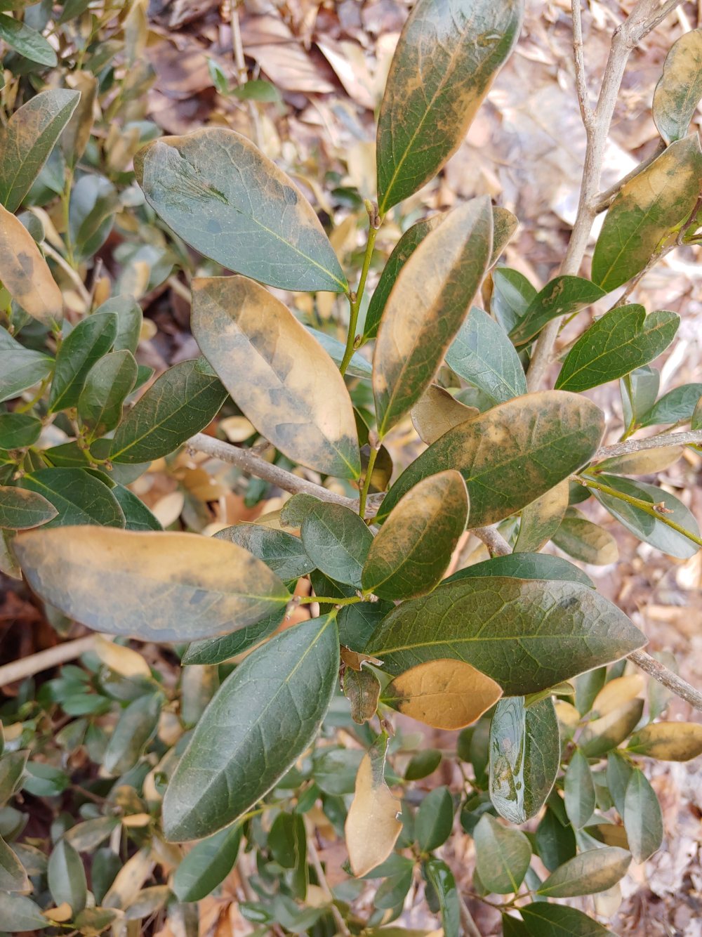 Several evergreens planted despite being marginally cold hardy have survived for years, even through a winter several years ago with multiple sub zero (Fahrenheit) nights. Following a recent winter when the low was eight above, no injury was apparent, but in every other year there have been brown leaves, though nothing more serious. Spring growth pushes out the damaged foliage, and by mid spring there’s no sign of winter damage. Gordlinia (x Gordlinia grandiflora) was planted as a replacement for a Franklinia that slowly declined, after a suitably sized replacement could not be found. It’s flowers are nearly identical to Franklinia, and its foliage similar except that it is evergreen. Evergreen yes, but annually damaged by any cold (below).