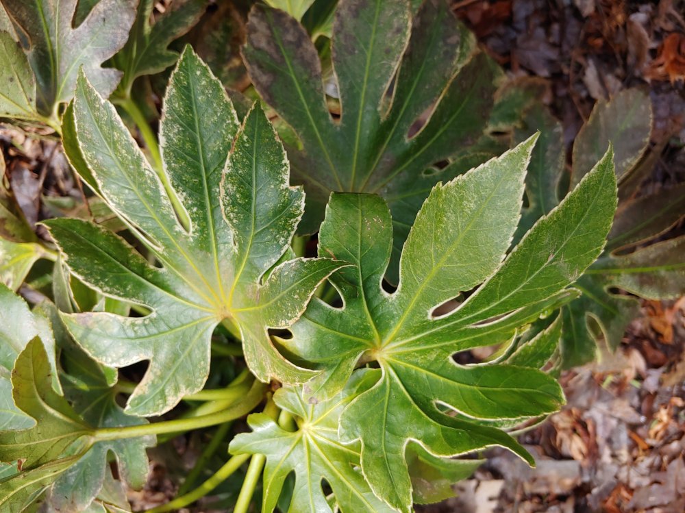 A trial through the winter of two marginally cold hardy plants is mostly a success. As expected, a variegated fatsia (Fatsia japonica ‘Spider’s Web’, below) suffered considerable damage when temperatures dropped below zero one night several weeks ago. Fatsia is rated as cold hardy to zero degrees (Fahrenheit), but I suspected this was a stretch. To be sure, several fatsias were protected with leaf filled cages through the winter, and these have survived with varying degrees of damage, but they’ll live. One that was left unprotected (as a test of hardiness) looks to be dead, though I’ll wait to see if it comes back from the roots. It’s possible, but I think unlikely. Now, I’ll know better for next year, and all fatsias will be protected.