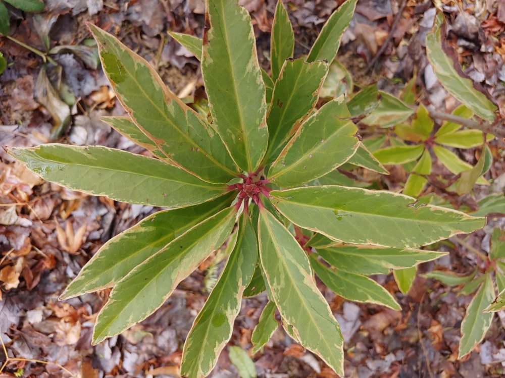 The other test was of ‘Pink Frost’ anise shrubs (Illicium floridanum ‘Pink Frost’, below), which were also protected by baskets of leaves. Results for one that was unprotected were much better than the fatsias, and in fact the unprotected shrub looks better than ones coming out of cages, in particular one that was crushed by a sheet of snow that slid off the roof of the front porch. The anise shrub appears to be accurately rated for zone 7 (to zero degrees F.), or perhaps a half zone hardier. Probably, it will not require winter protection in the future.