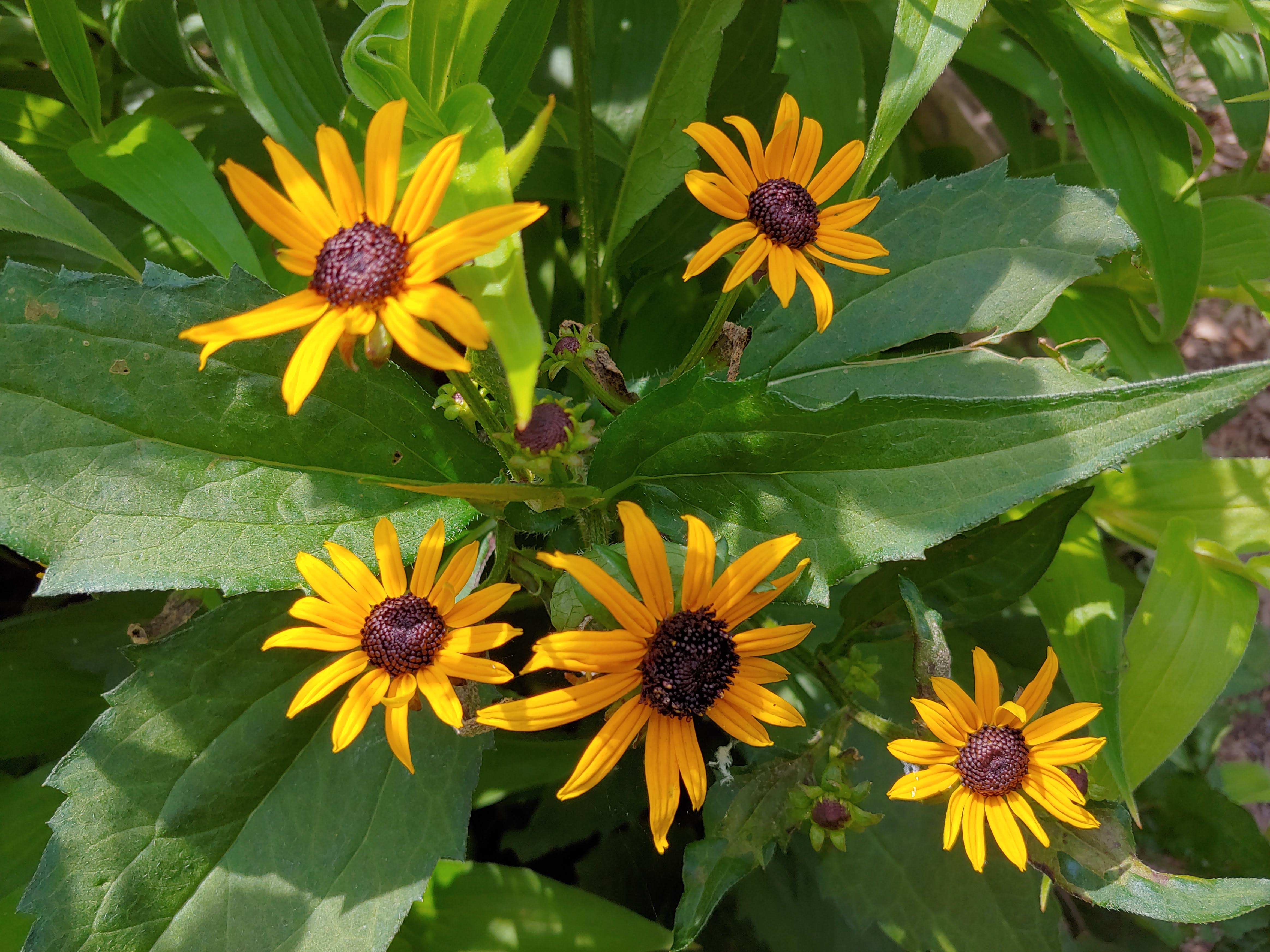 Seedlings are common in this garden. Toad lilies (Tricyrtis) and ferns regularly spread by seed or spore, and others are typically found in close proximity to the parent. Today, I am surprised to see a small flowered Blackeyed Susan (Rudbeckia, below) growing between two toad lilies and a yellow flowered Baptisia. With no more than a quick glance in recent weeks, I presumed this was a coneflower (Echinacea) seedling, but now that there are flowers, the question is, where did it come from?