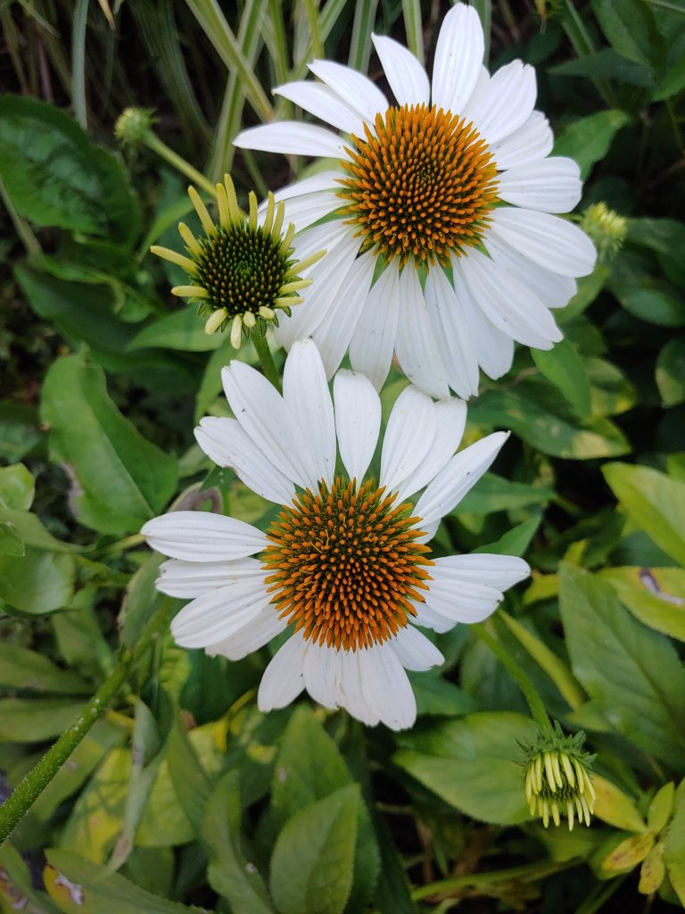 While the origin of a small clump of purple coneflowers (Echinacea purpurea, above) is obvious, I’ve questioned over two years if the purple should be left in place, and would it eventually overrun the white flowered parent plant (below)? Again this year, the answer is not clear, but another vigorous toad lily and a slowly spreading clump of carex threaten both. For now, a minor amount of pruning and digging of the carex frees enough space, but this is not a long term answer.