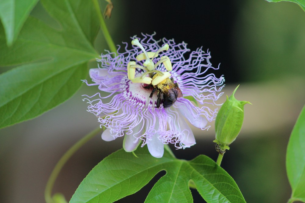 A second yellow flowered passionflower must be planted so that it winds through more accessible, and lower growing shrubs. Though the yellow flowered variety has climbed twenty feet into the cherry, its foliage is much less lush than the purple flowered vines, and it would barely be noticed until flowering.