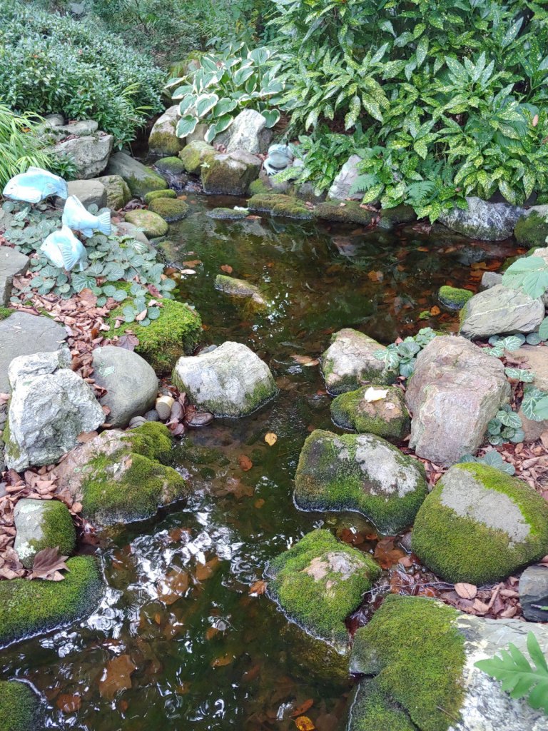 As I wander down stone paths that border ponds, and the stream edged by moss covered rocks, small frogs leap for safety, with only a brave (or foolish) few remaining on some large leaf that arches over the water. There are dozens of splashes as I walk, trowel in hand, prepared for the day’s planting.