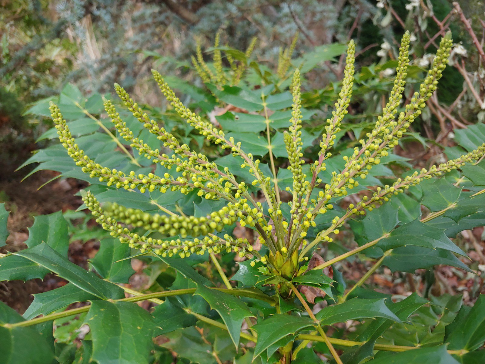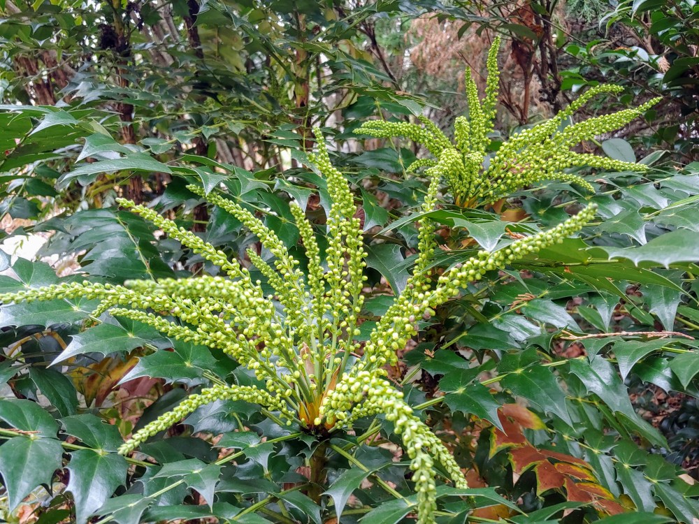 The late autumn flowering mahonias have been teasing for a few weeks, with buds that preview the yellow flowers. The buds should open soon, and flowers are not damaged unless temperatures drop into the mid-teens. There are several cultivars of the autumn flowering mahonias in the garden. Several ‘Winter Sun’ (Mahonia x media ‘Winter Sun’, above) were planted long before the others, then ‘Charity’, ‘Underway’, and ‘Marvel’ were added.