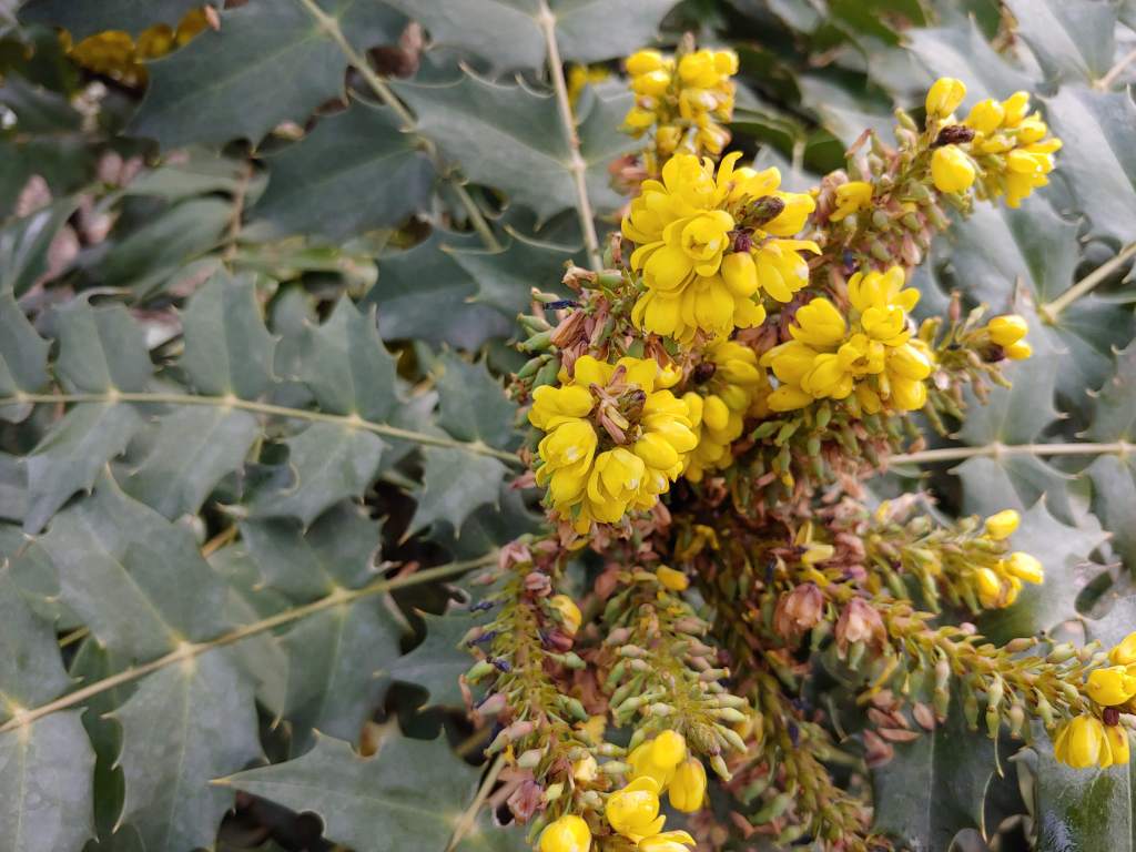 A winter daphne has finally perished (actually removed, though not fully deceased), probably due to the somewhat finicky nature of daphnes in general and nothing I did wrong (this time), so a few fragrant blooms have been lost. This daphne is marginally cold hardy for the area, but I suspect a different culprit caused its demise. In the absence of the daphne’s blooms, ‘Winter Sun’ (above) and ‘Charity’ mahonias (Mahonia x media) have flowered since late November. The last blooms are now fading at the end of February, a month longer than I’ve seen in the past, and again overlapping with the late winter flowering leatherleaf mahonia (Mahonia bealei).