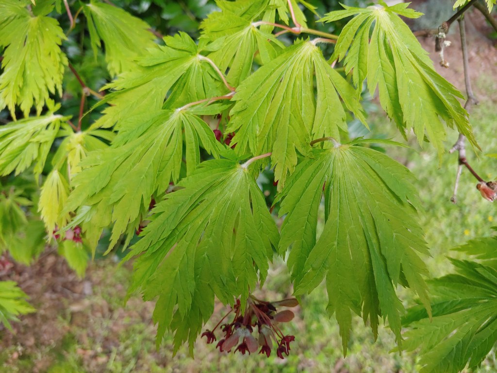 Early spring is the peak, when colors of Japanese maples are most vivid. And while flowers of maples are small and not highly ornamental, I am captivated by the dangling blooms and newly emerging foliage.